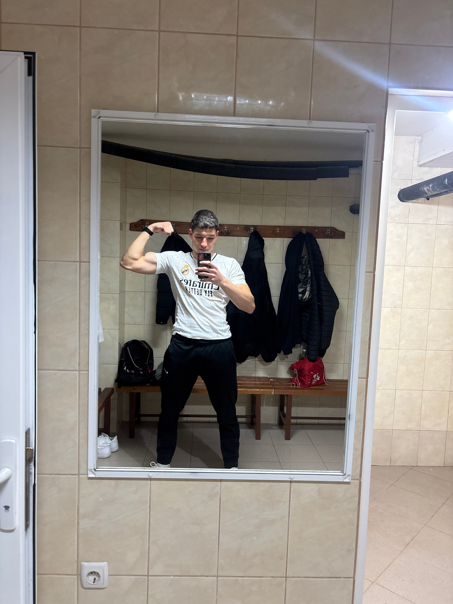 The image shows a man posing in front of a mirror in what appears to be a locker room or changing area. He is flexing his bicep and holding a phone in his other hand, likely taking a selfie. The room…read more