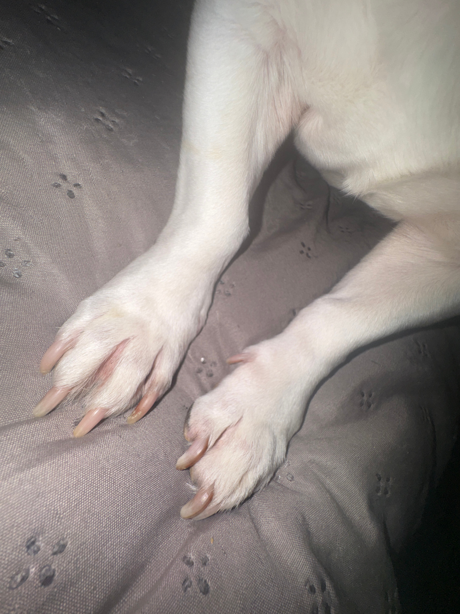 The image shows the front paws of a white dog resting on a gray quilted surface. The dog's nails are long and untrimmed. There is no indication of the image's location being Varna, Bulgaria.