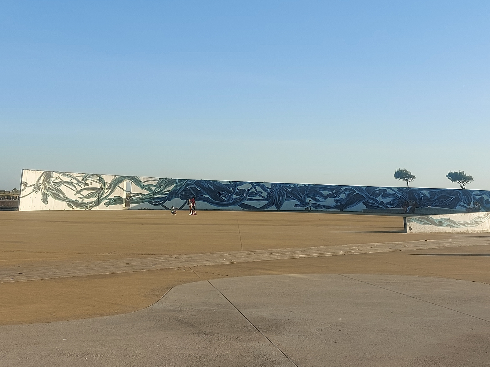 The image shows a public space in Figueira da Foz, Portugal, with a long, low wall featuring a mural of blue and white wave-like patterns. The sky is clear and blue. Two small trees are visible behind…read more