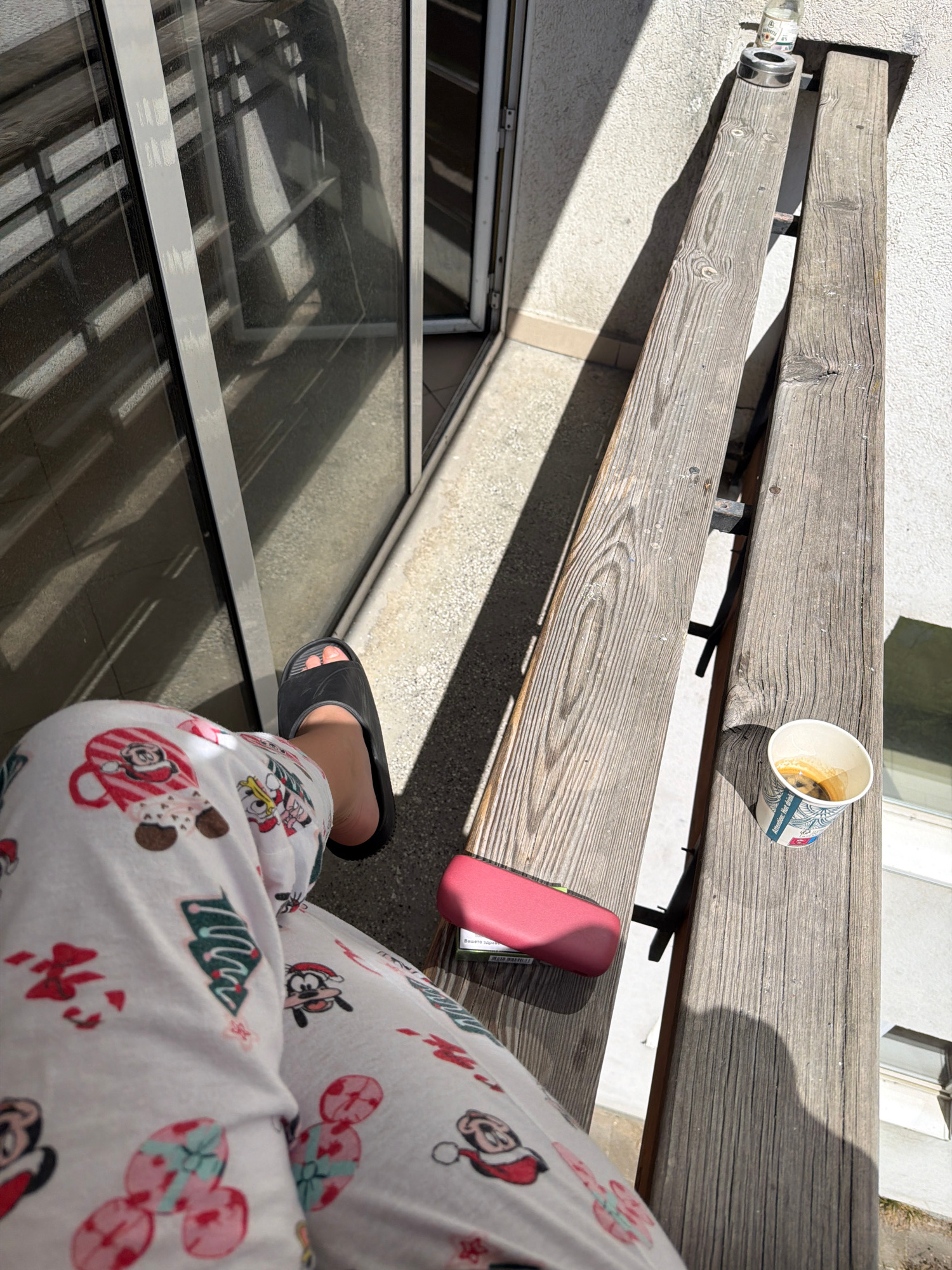 An overhead, high-angle shot captures a person's leg and foot in a relaxed outdoor setting, likely a balcony or patio in Sofia, Bulgaria. The person is wearing white pajamas patterned with festive Chr…read more