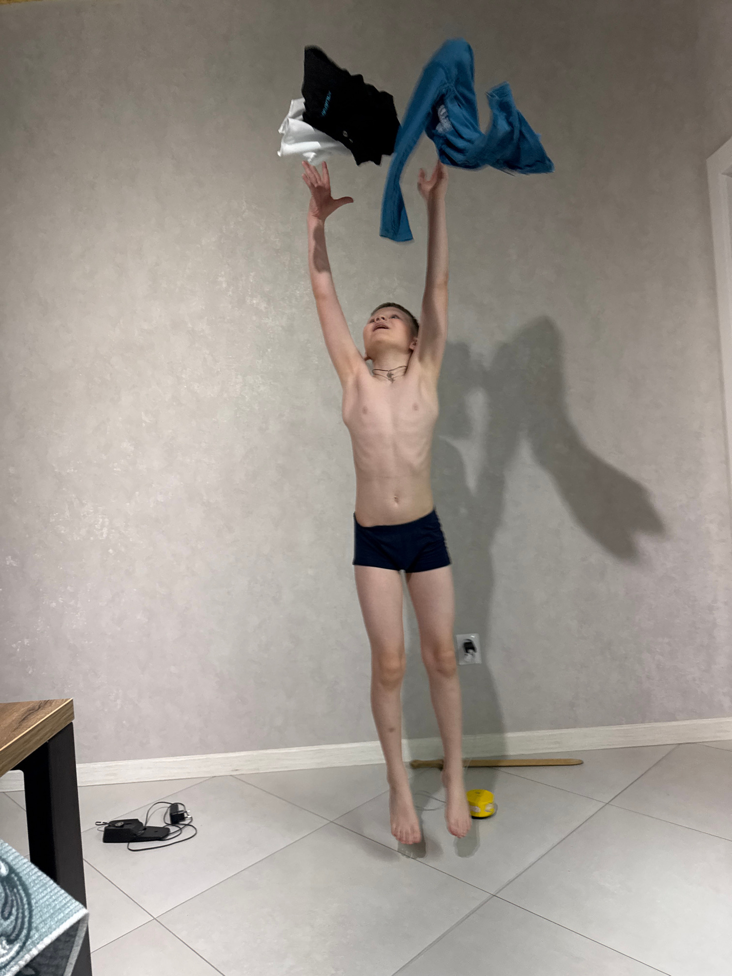 A shirtless young man in dark underwear is lying horizontally on the floor of a room in Gornyi (Dvurechenskoe S/P), Russia, with his arms outstretched, appearing to simulate flight. Items of clothing…read more