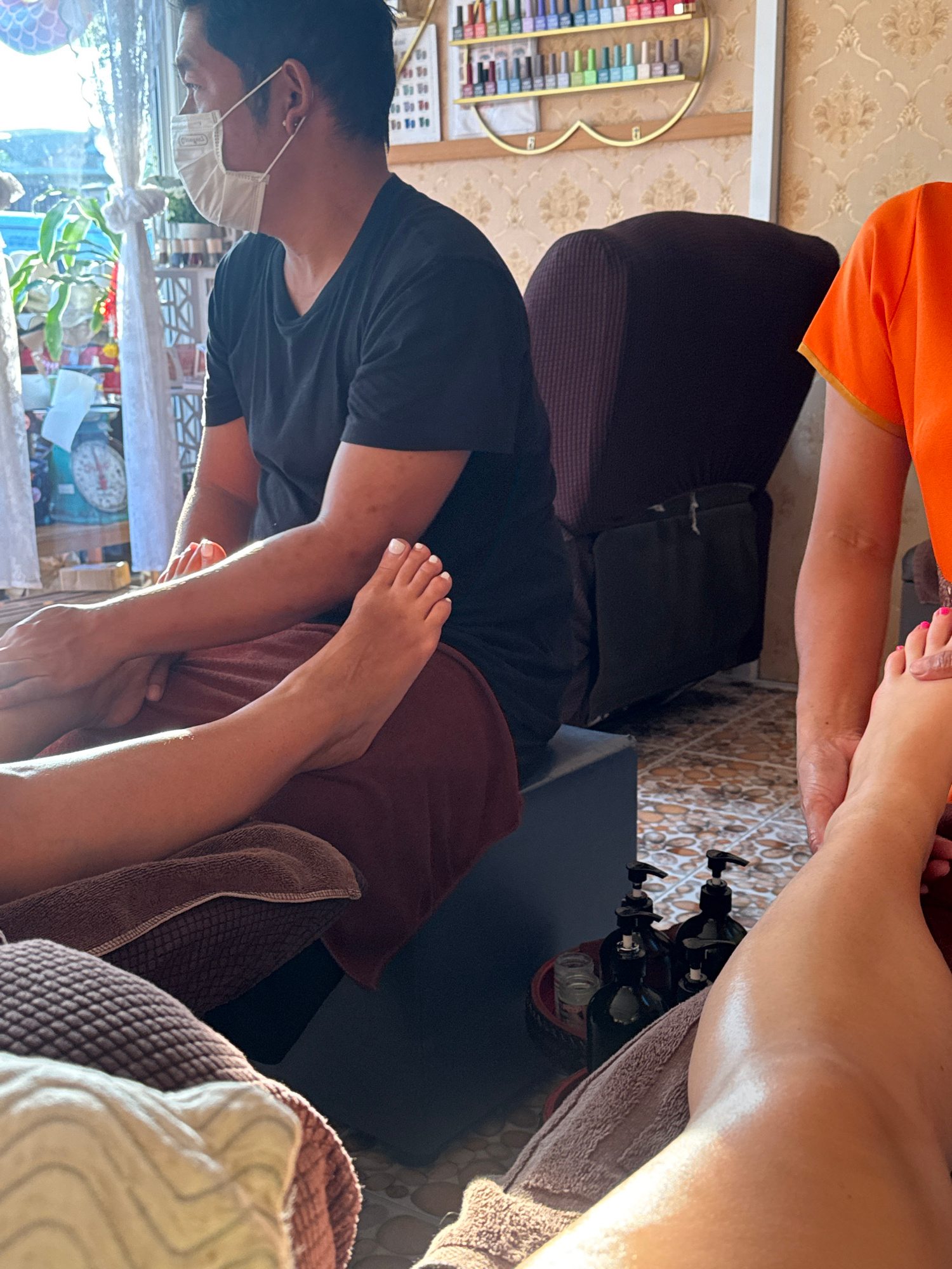 A person wearing a black t-shirt and a surgical mask is providing a foot massage to someone with white nail polish on their toes. Another person in an orange shirt is visible. The setting appears to b…read more