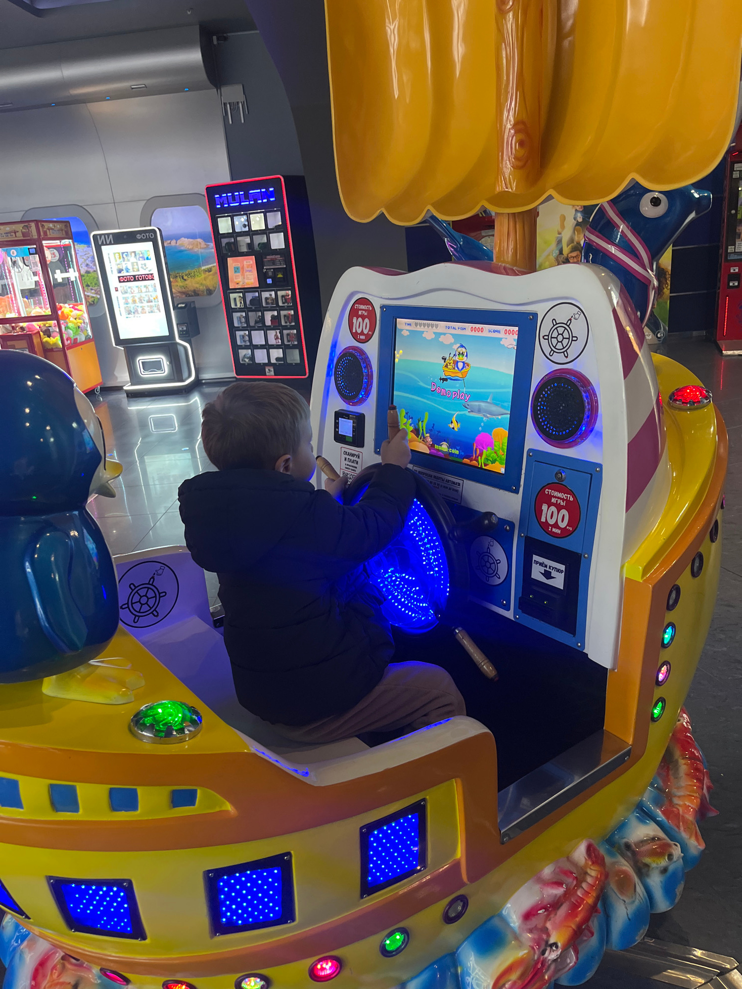 A young child, wearing a dark blue puffer jacket and light brown pants, is intensely focused on playing an arcade game. The child, seen from behind, has light brown hair and is actively engaging with…read more