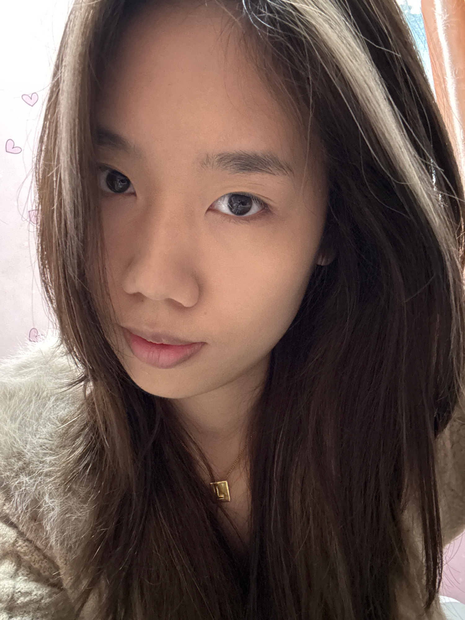 A portrait of an Asian female with brown hair and blonde highlights is presented. She is wearing a beige sweater and a gold necklace. The background features pink hearts. There is no indication of the…read more