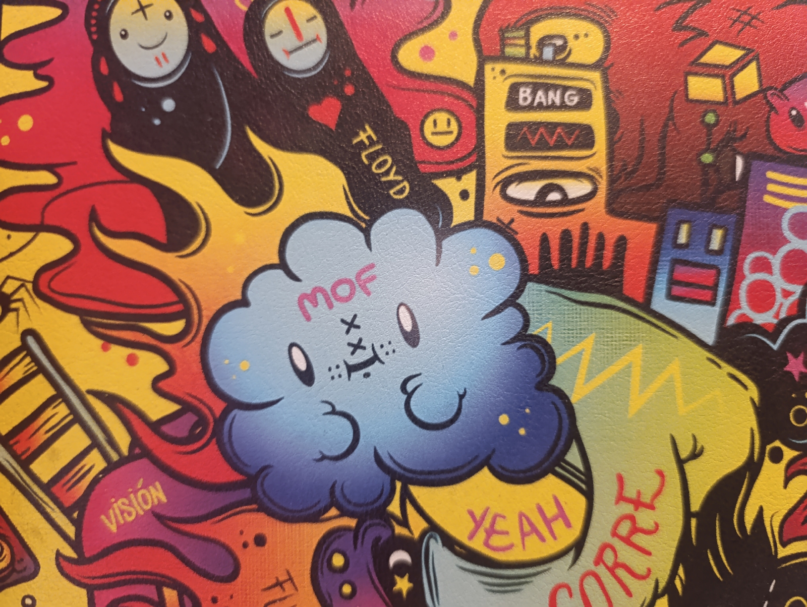The image is a close-up of a graffiti-style mural. The mural features a mix of cartoon-like characters, abstract shapes, and text. A central element is a light blue cloud-shaped character with the let…read more