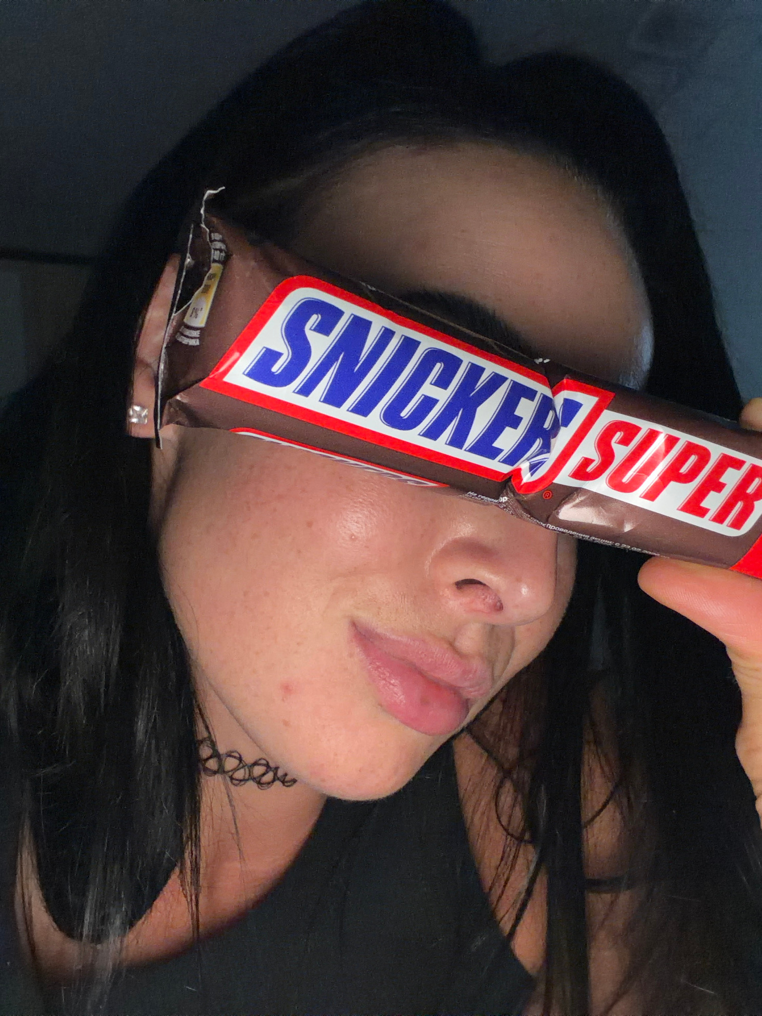 An image captures a person holding a Snickers Super chocolate bar horizontally across their face, effectively obscuring their eyes. The shot is angled, revealing the person's nose, mouth with full lipβ¦read more