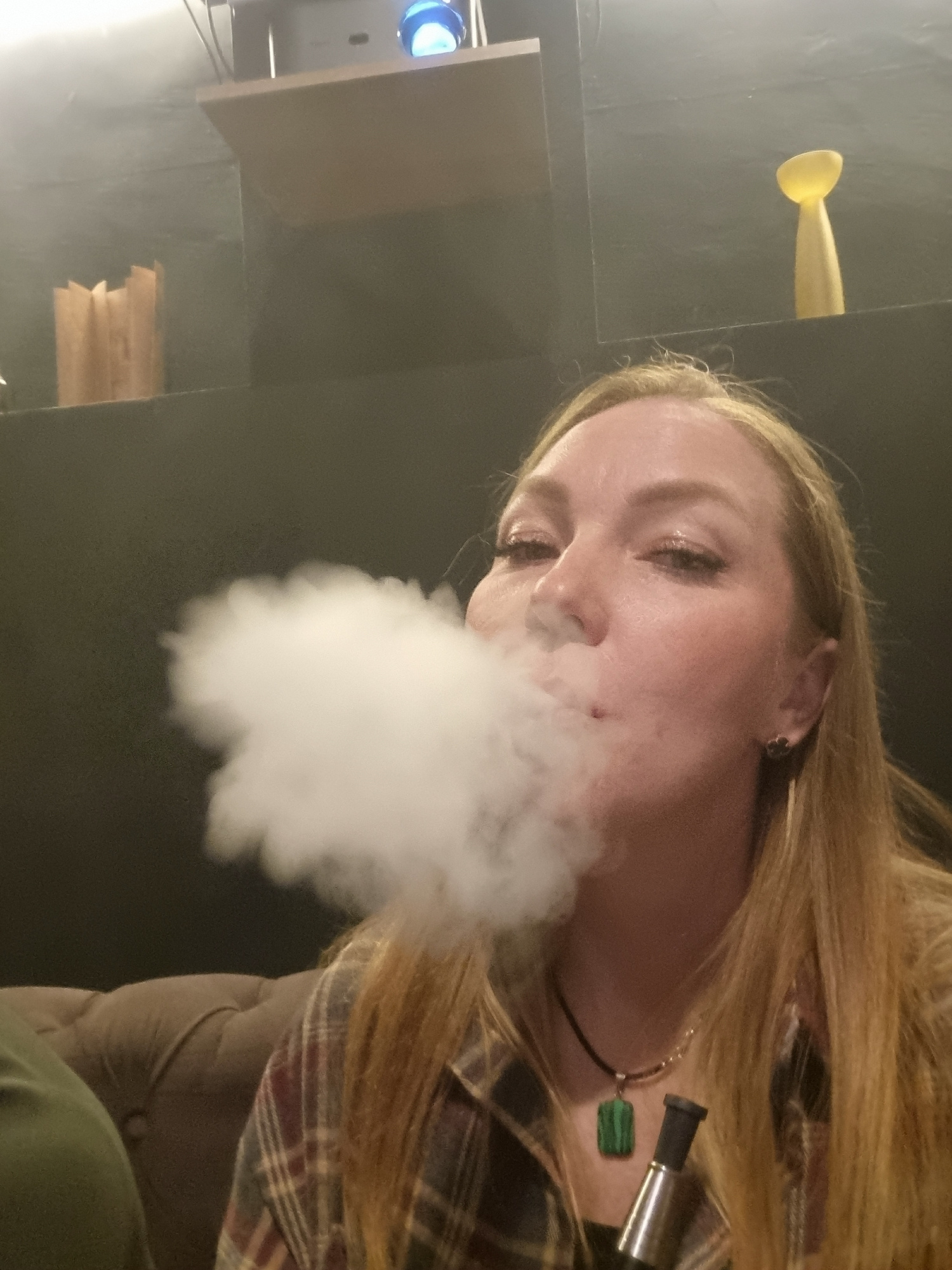 This image, taken in Chaikovsky, Russia, shows a close-up, angled view of a person with long blonde hair, exhaling a large cloud of white vapor. The person's face is visible, with eyes partially close…read more