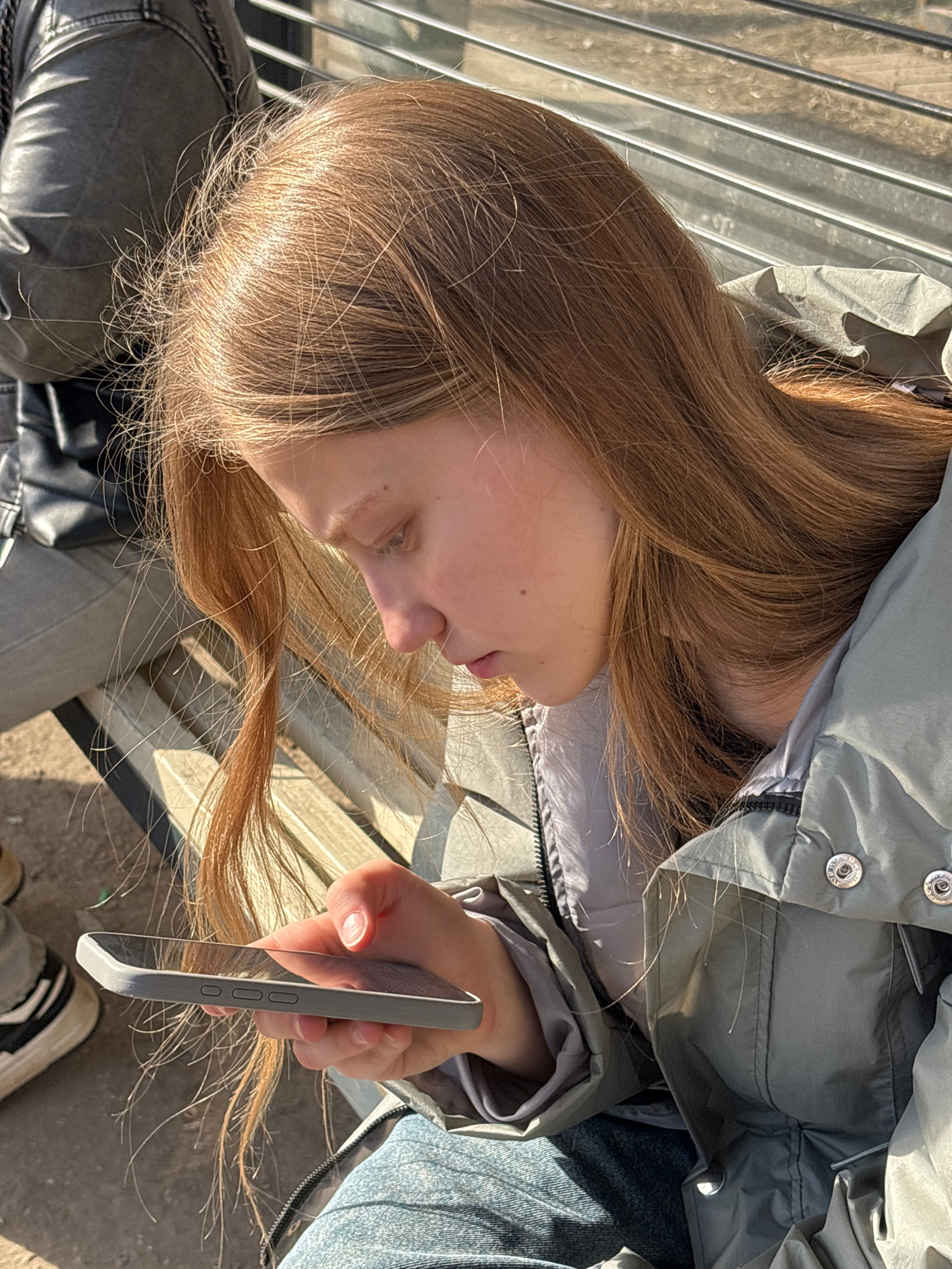 A person, possibly a young female, is seated outdoors, possibly in Perm, Russia. The person is wearing a light gray puffer jacket over a gray shirt and blue jeans. The person is holding a gray smartphβ¦read more