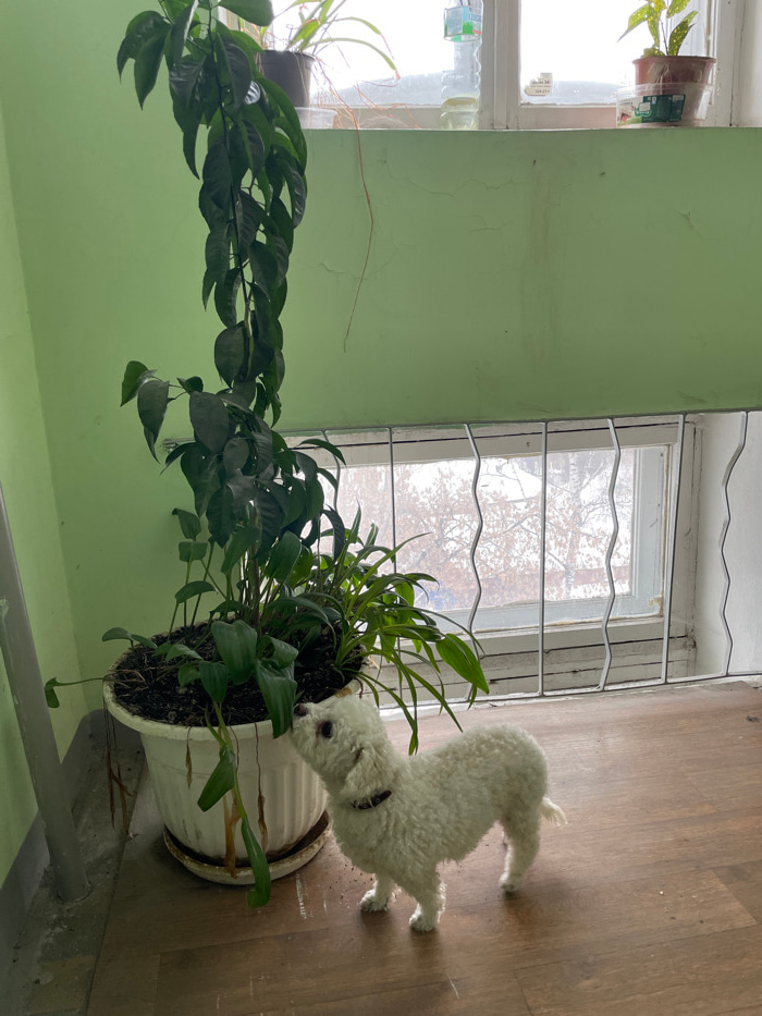 The image displays an interior scene located within Yekaterinburg, Russia. A small, white, curly-haired dog, wearing a dark collar, stands on a brown laminate floor in the lower right, with its snout…read more