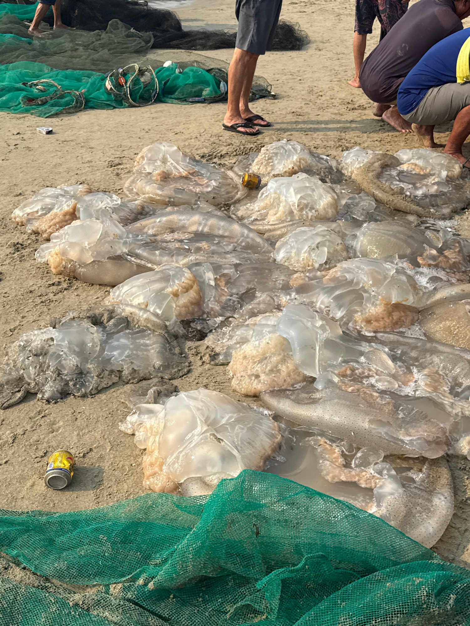 The image shows a sandy area in Đà Nẵng, Vietnam, strewn with a large pile of jellyfish. Two people are seen from the knees down near the jellyfish. One person is wearing dark shorts and flip-flops, w…read more