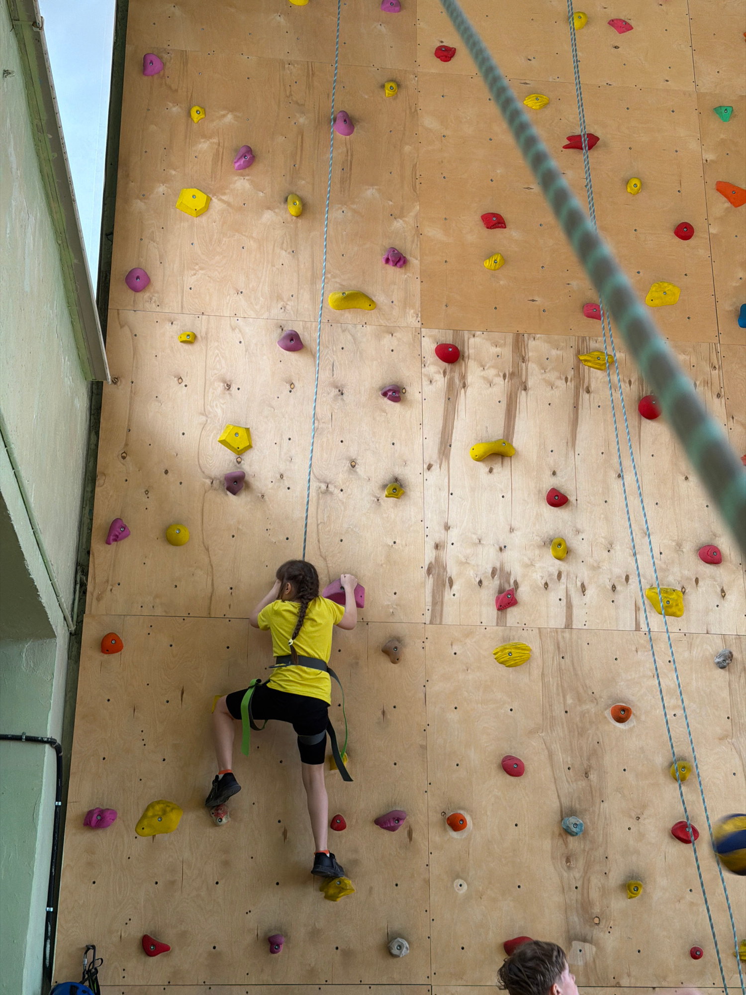 A girl is climbing an indoor rock climbing wall. The wall is made of wood and has various colored holds attached to it. The girl is wearing a yellow shirt, black shorts, climbing shoes, and a climbing…read more