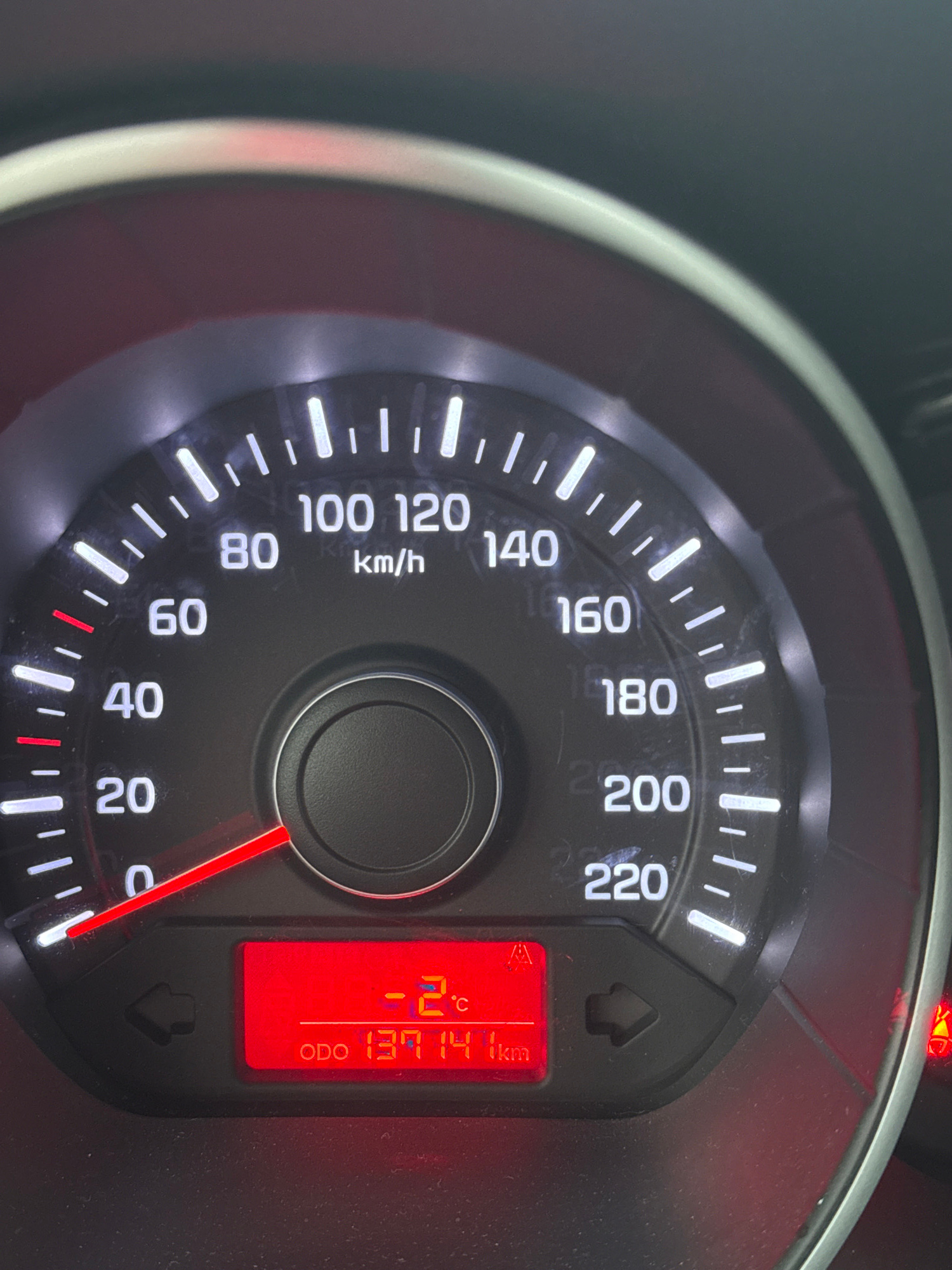 The image shows a car's instrument panel. The speedometer reads approximately 2 km/h. A digital display indicates an outside temperature of -2 degrees Celsius and an odometer reading of 137,141 km.
