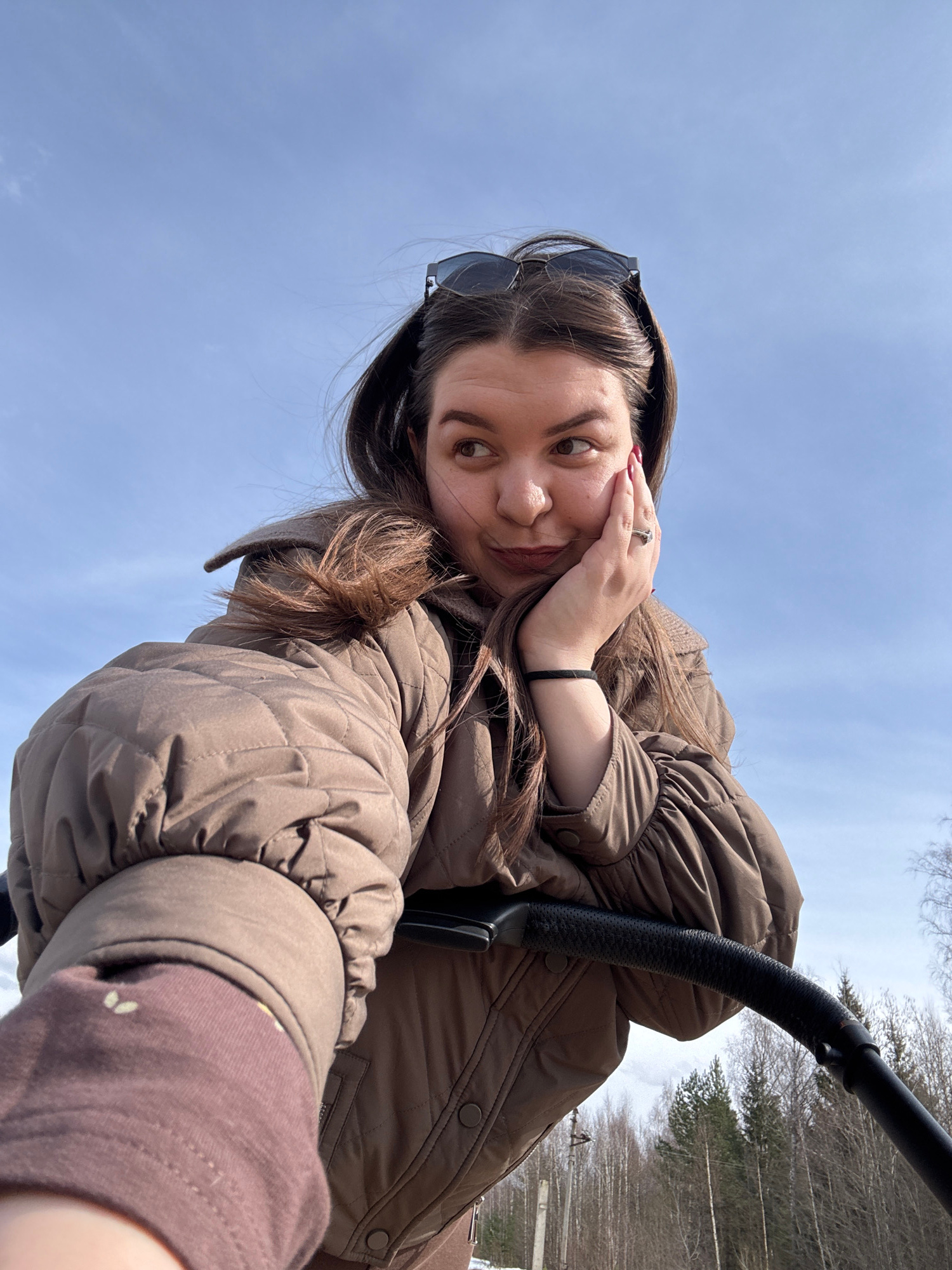 A selfie shows a woman with dark hair and sunglasses perched on her head, wearing a brown puffer jacket, posing on a ski lift. She is holding her hand up to her face in a playful pose. Behind her is a…read more