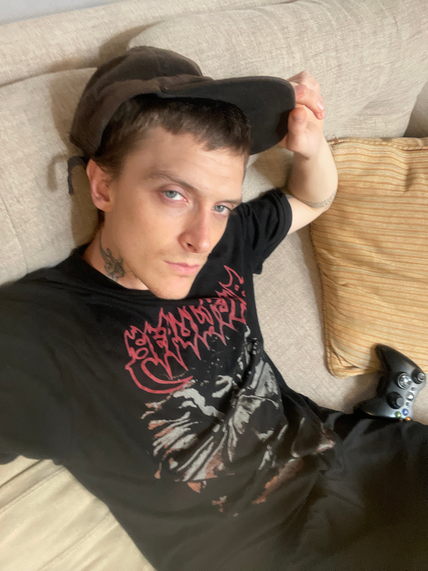 A young adult male is lying on a beige couch in an indoor environment. He is wearing a black t-shirt with a graphic design in white and red, and a dark-colored baseball cap. His right hand is position…read more