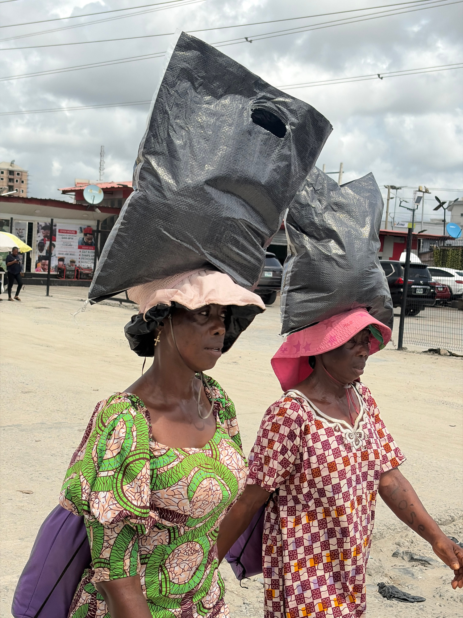 This image captures two women standing outdoors in an urban setting in Igboefon, Nigeria, likely during daytime under an overcast sky. Both women are prominently featured, carrying large, dark, possib…read more