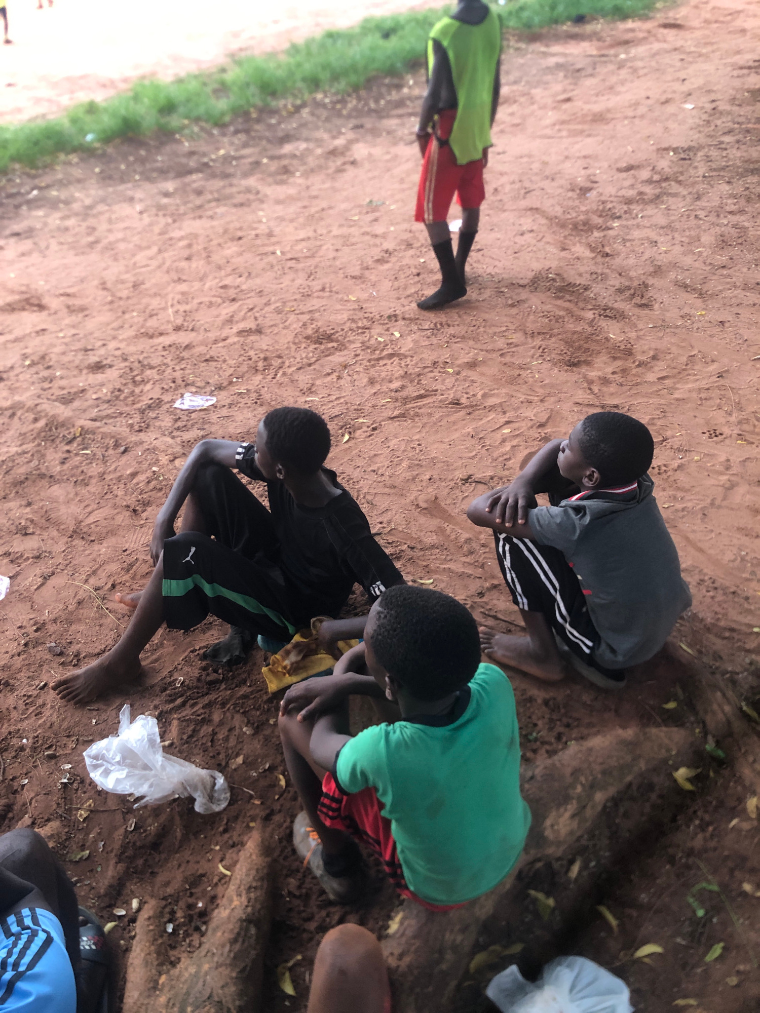 The image shows a group of boys in Ukwu-Abwa, Nigeria, on reddish-brown soil near a grassy area. Three boys are crouched close together in a circle, while another boy stands further away. The boys are…read more
