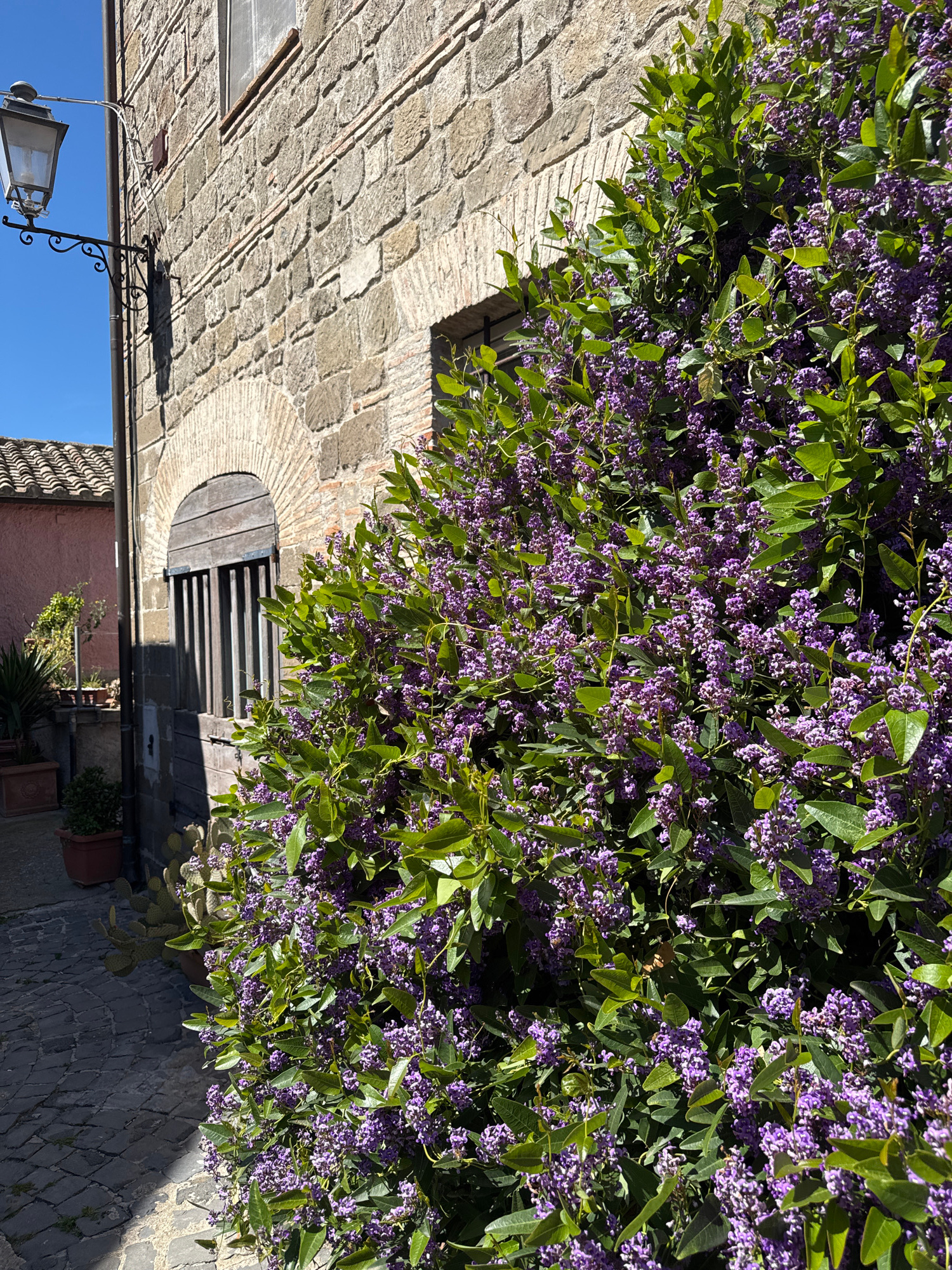 The image shows an upward-angled view of a building and lush vegetation in Castelnuovo di Porto, Italy. The left side of the frame features a stone building with arched windows, one partially covered…read more
