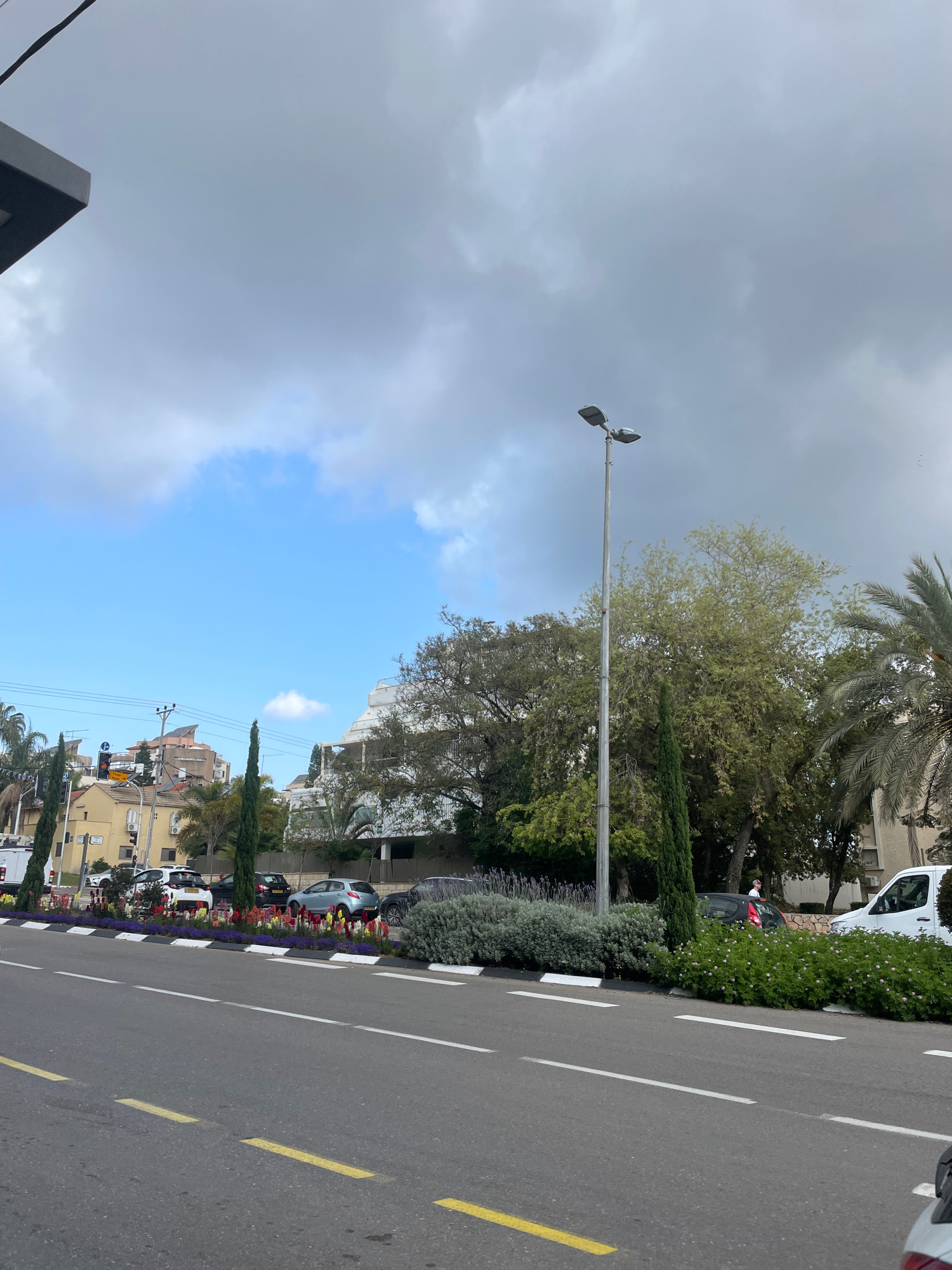 The image depicts a street scene in Raanana, Israel. The view is taken from ground level, looking along a road with multiple lanes marked by white and yellow lines. On the right side of the road, ther…read more