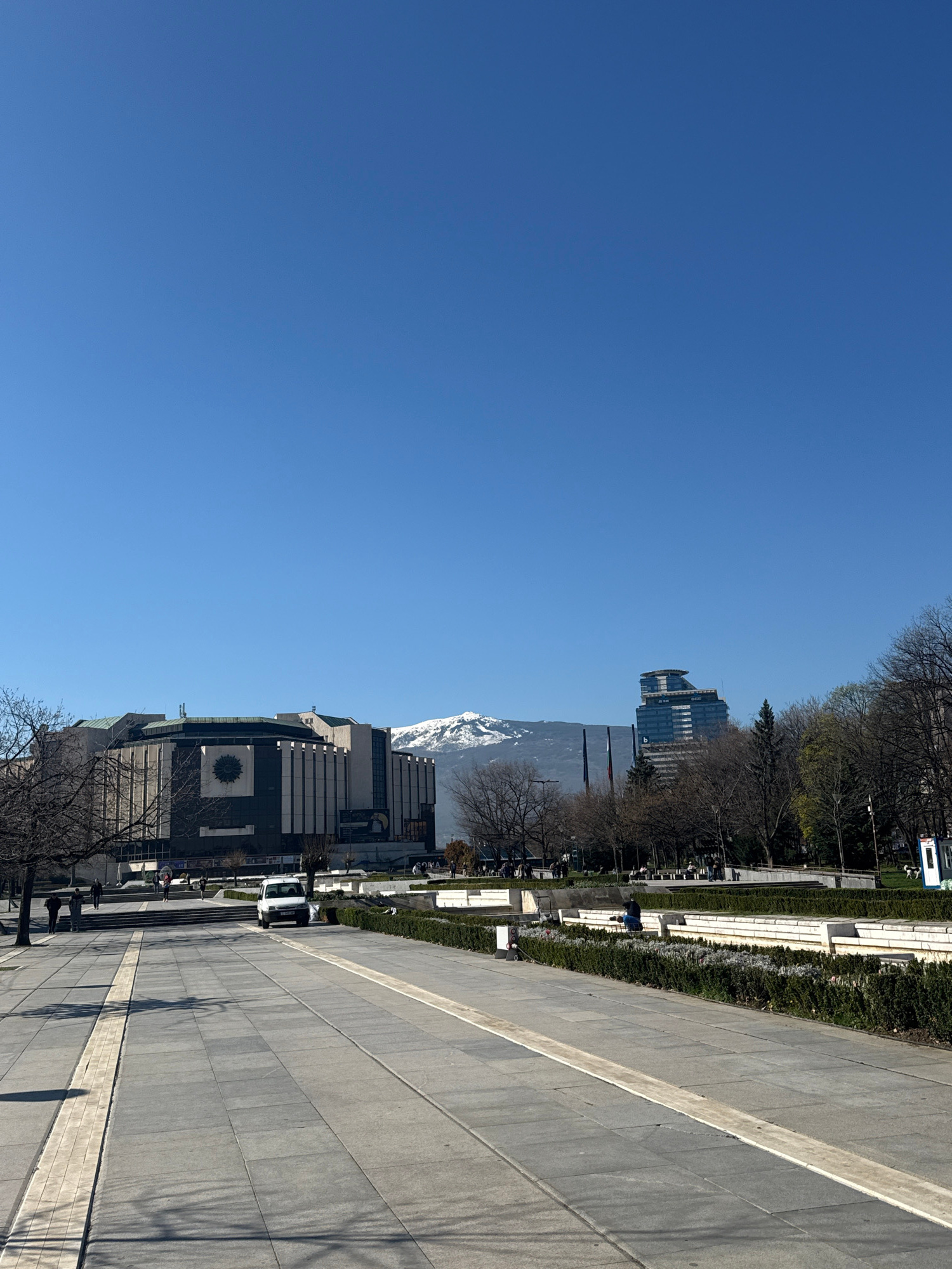 This image shows a wide, paved pedestrian area in Sofia, Bulgaria, likely a central plaza. The sky is clear blue. Buildings line the plaza, including the National Palace of Culture (NDK) and a modernβ¦read more