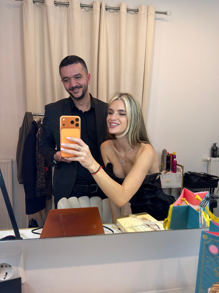 A smiling couple poses for a selfie in front of a mirror. The woman, in a black dress, leans towards the man, who wears a black blazer and holds an orange phone. Beige curtains are visible in the back…read more