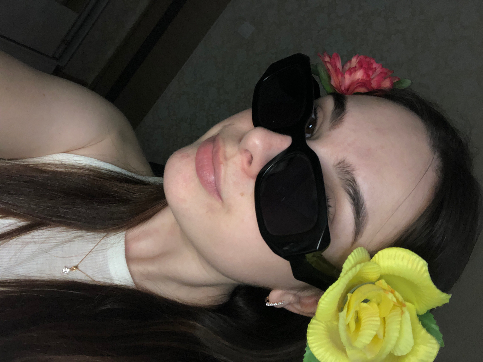 A woman with long, dark hair is wearing large black sunglasses. She has a yellow flower in her hair on the top of her head and a red and pink flower near her temple. She is wearing a white tank top an…read more