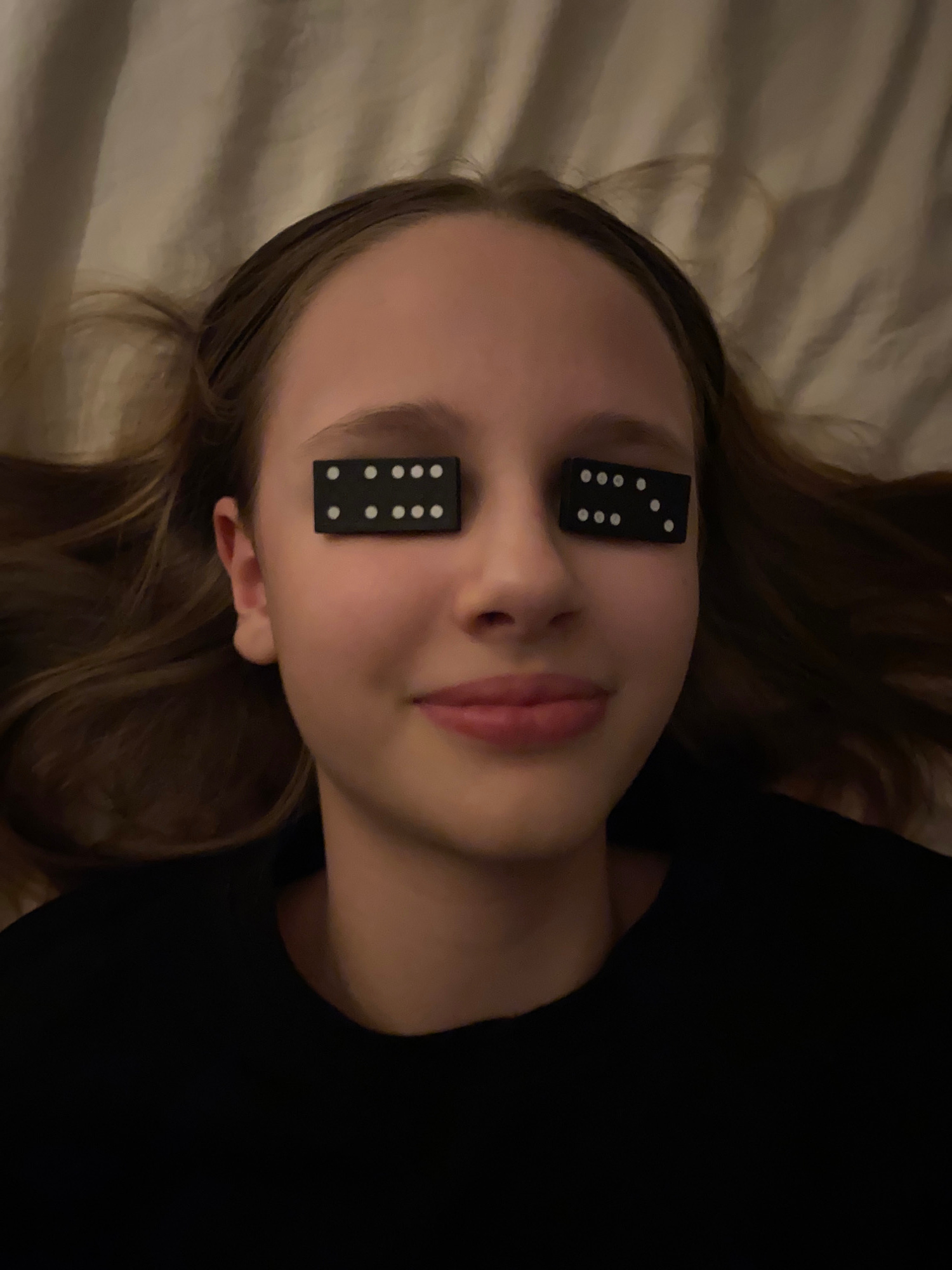 A person, likely a young female, lies supine on a wrinkled, light-colored surface, possibly a bed. Two dominoes are placed over their eyes, each displaying six dots. The person's hair is brown and spr…read more