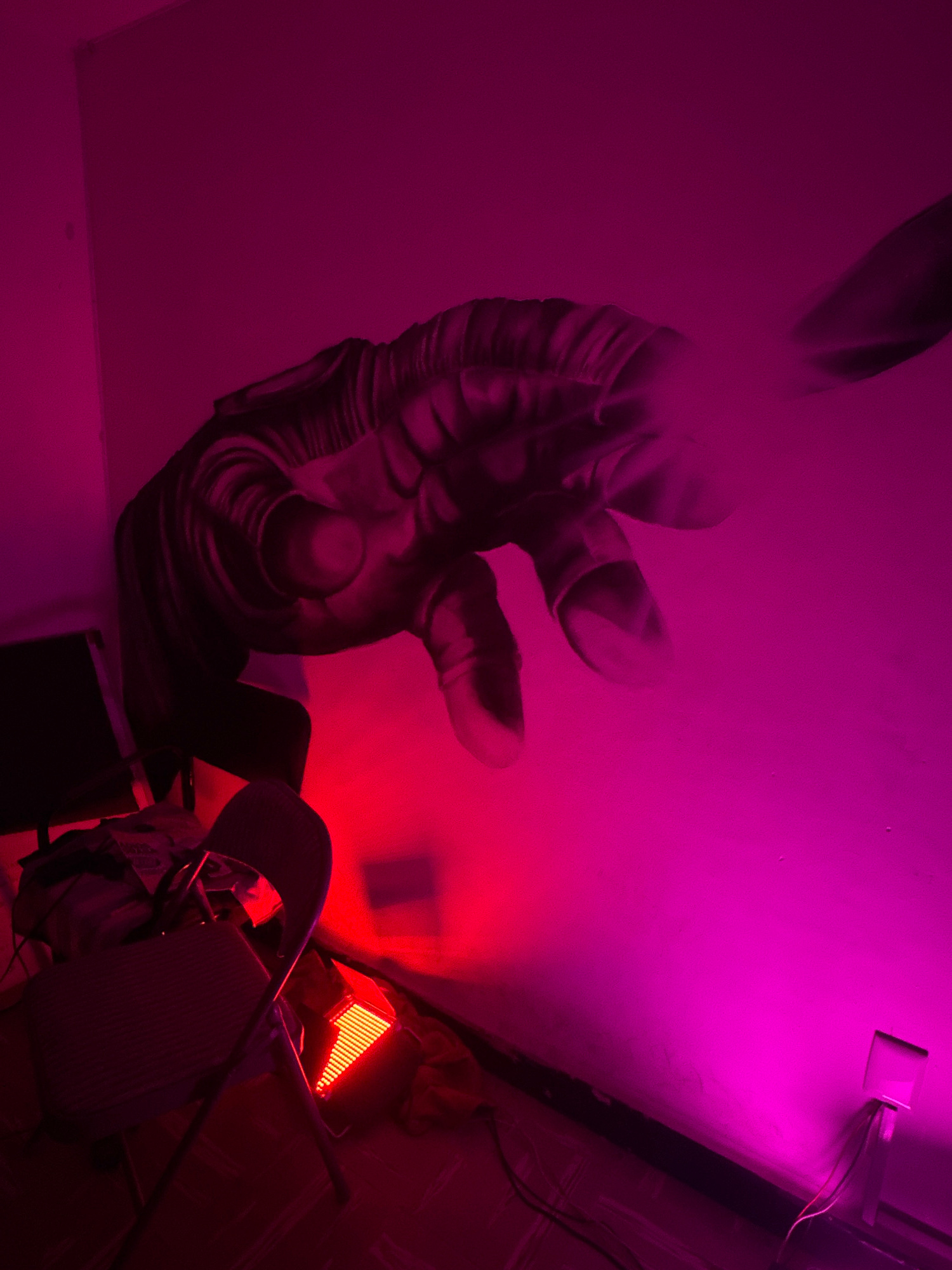 The image captures an indoor scene dominated by artificial lighting in shades of pink, magenta, and red, suggesting a nighttime or low-light setting. A large, detailed mural of a human hand is painted…read more