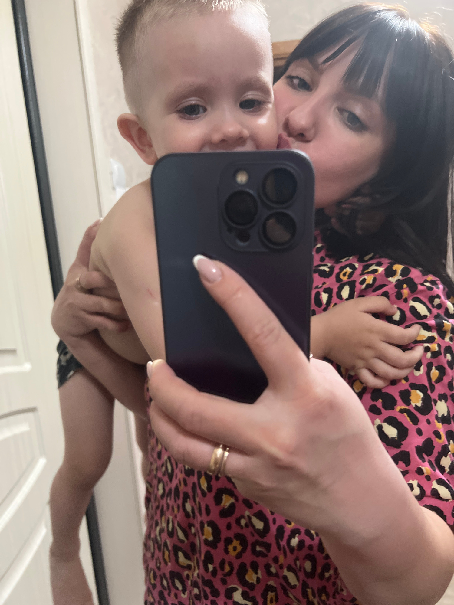 A selfie photograph shows a woman and a baby, seemingly a mother and child. The woman has dark hair and is wearing a pink top with a black and yellow leopard print. She is kissing the baby's cheek whi…read more