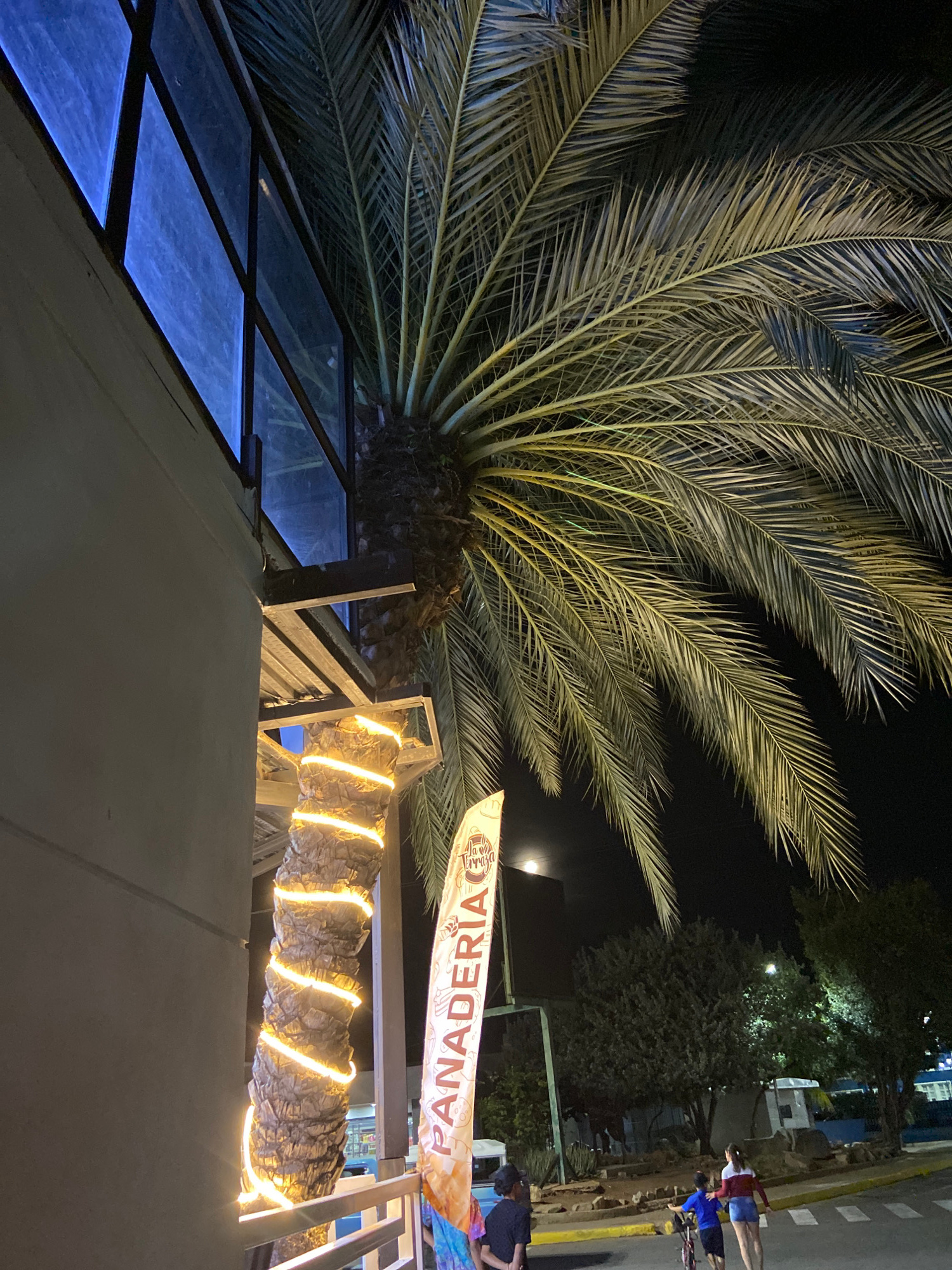 A nighttime, long-exposure shot presents a palm tree dominating the left side of the frame, its fronds extending towards the top. The tree partially covers a structure with a blue-lit, glass-paneled r…read more