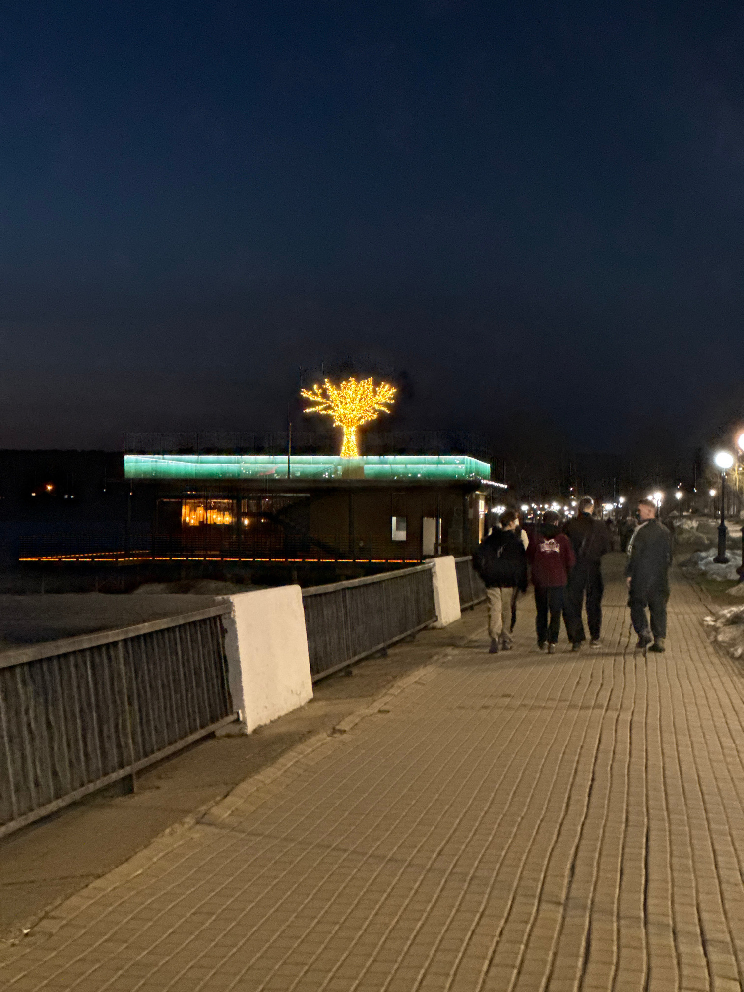At night, a group of people walk along a sidewalk in Votkinsk, Russia. A building with a lit-up tree stands adjacent to the sidewalk. The area is illuminated by streetlights, and the sky is dark.