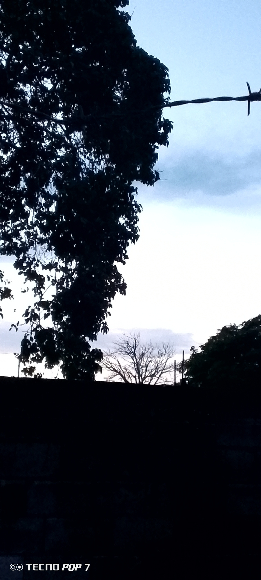 A low-angle, dusk or dawn scene shows trees silhouetted against a bright sky, likely in Altagracia, Venezuela. A wire, possibly barbed, stretches across the upper right corner. The foreground is dark,…read more