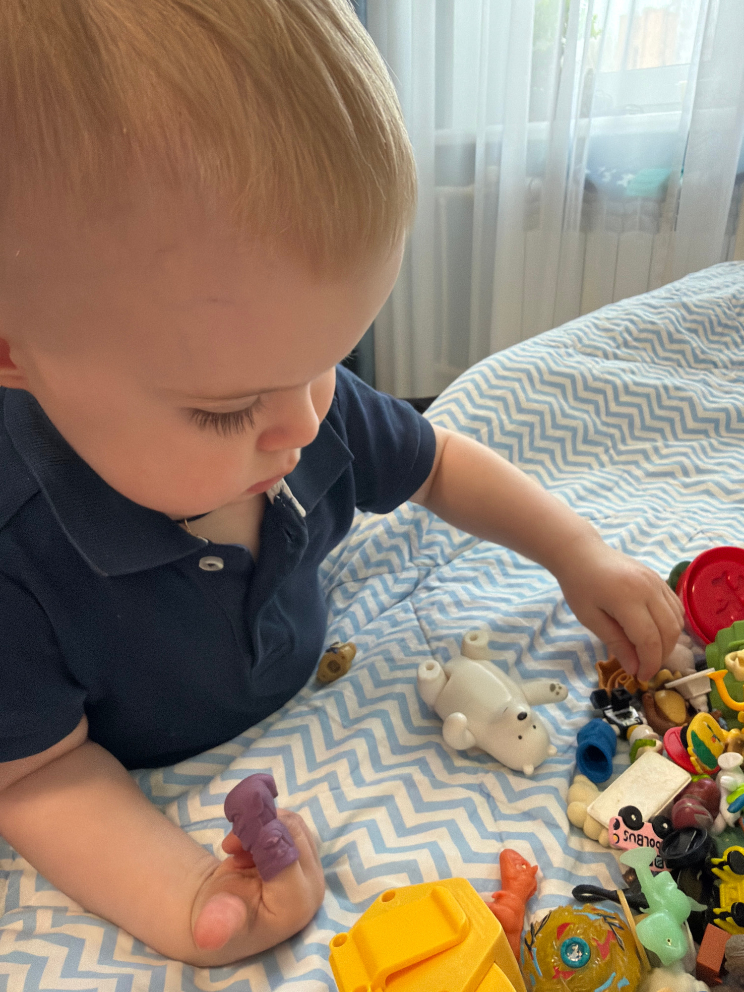 A child with blonde hair, wearing a dark blue shirt, lies on a bed covered with a blue and white zigzag patterned sheet. The child is surrounded by various toys. The exact location within the city of…read more