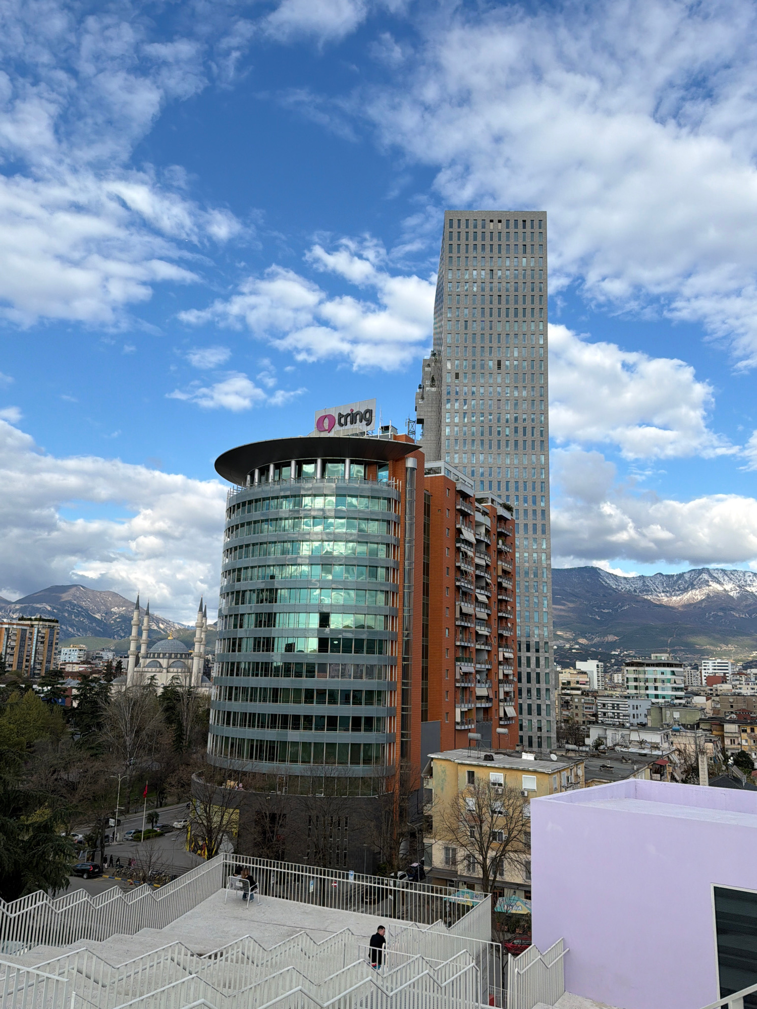 The image depicts a panoramic view of Tirana, Albania, featuring a juxtaposition of modern architecture and natural landscapes. The foreground showcases a tall, cylindrical glass building with the "OT…read more