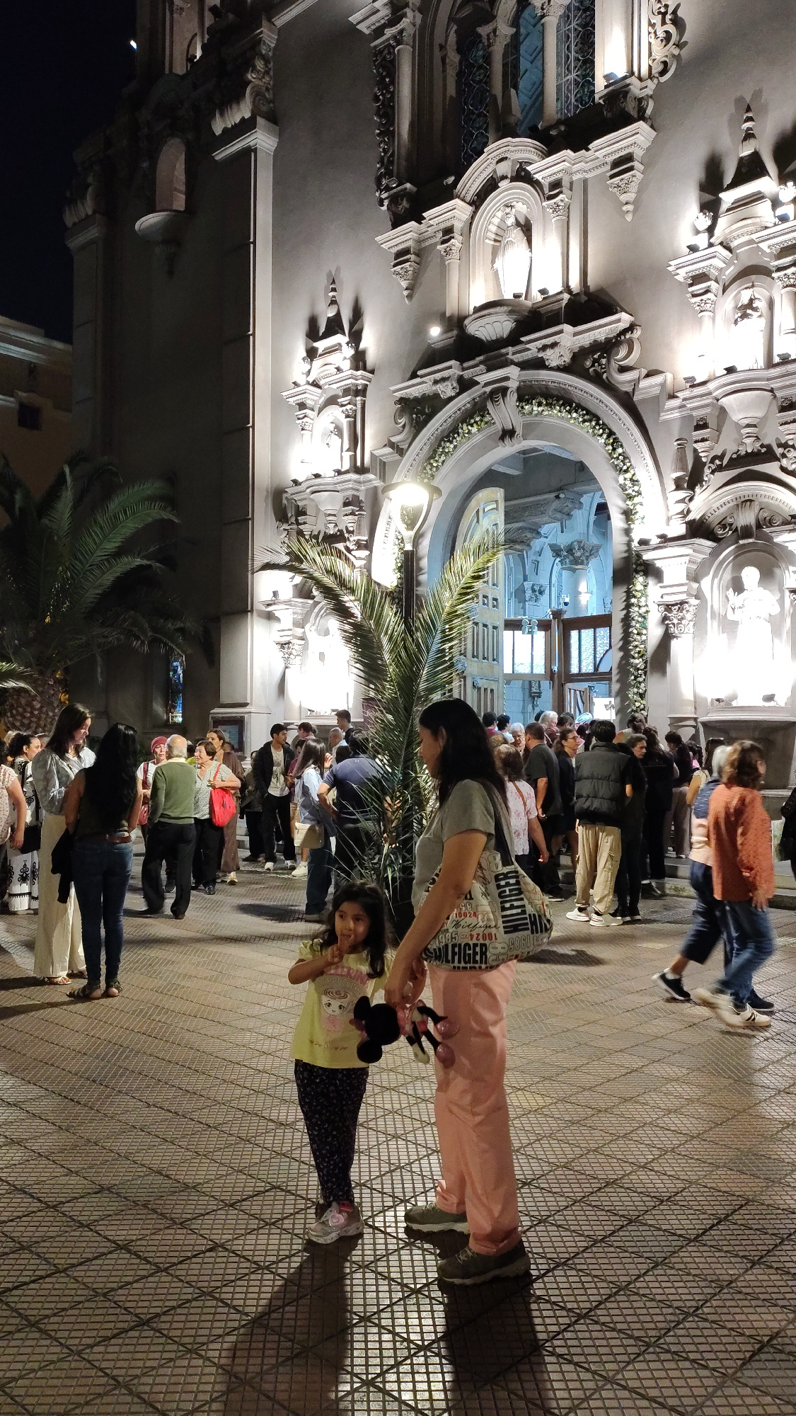 A medium shot captures a nighttime scene on a tiled public square in Miraflores, Peru, with a crowd of people gathered in front of a baroque-style building. The building's facade is illuminated with b…read more