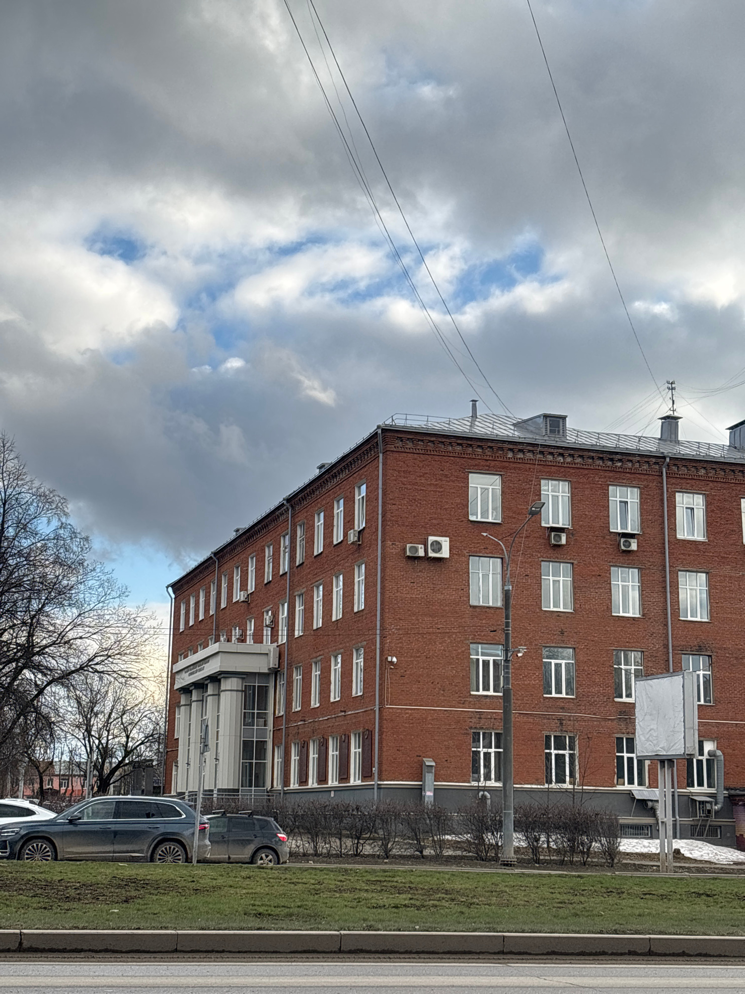 The image depicts a red brick building with multiple windows, some with air conditioning units, set against a sky filled with clouds. Overhead power lines stretch across the frame. A strip of green ve…read more