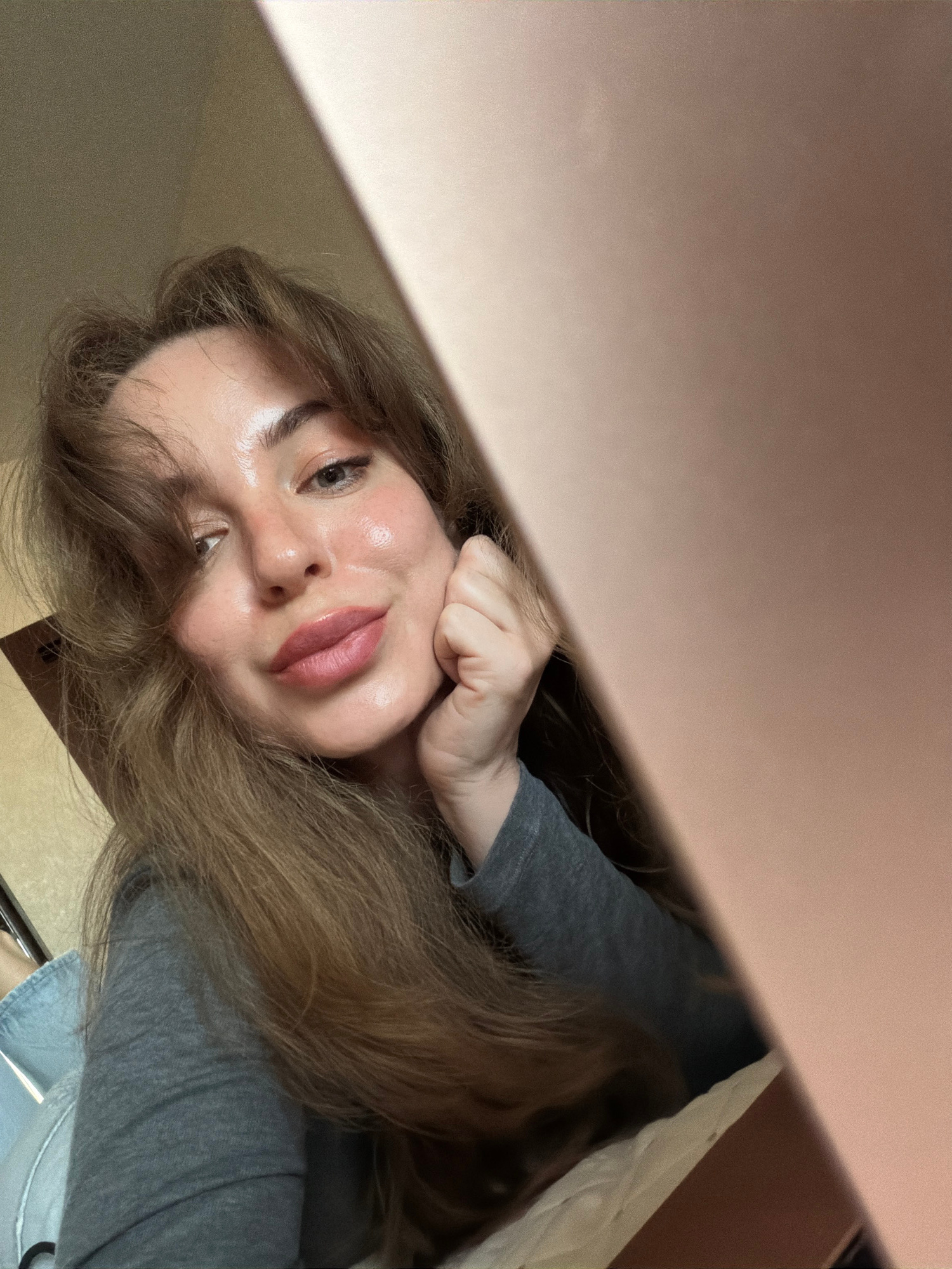 A woman with long brown hair is looking upwards at the camera with a slight smile. She has fair skin, full lips, and light-colored eyes. Her left hand is resting on her cheek. She is wearing a gray lo…read more