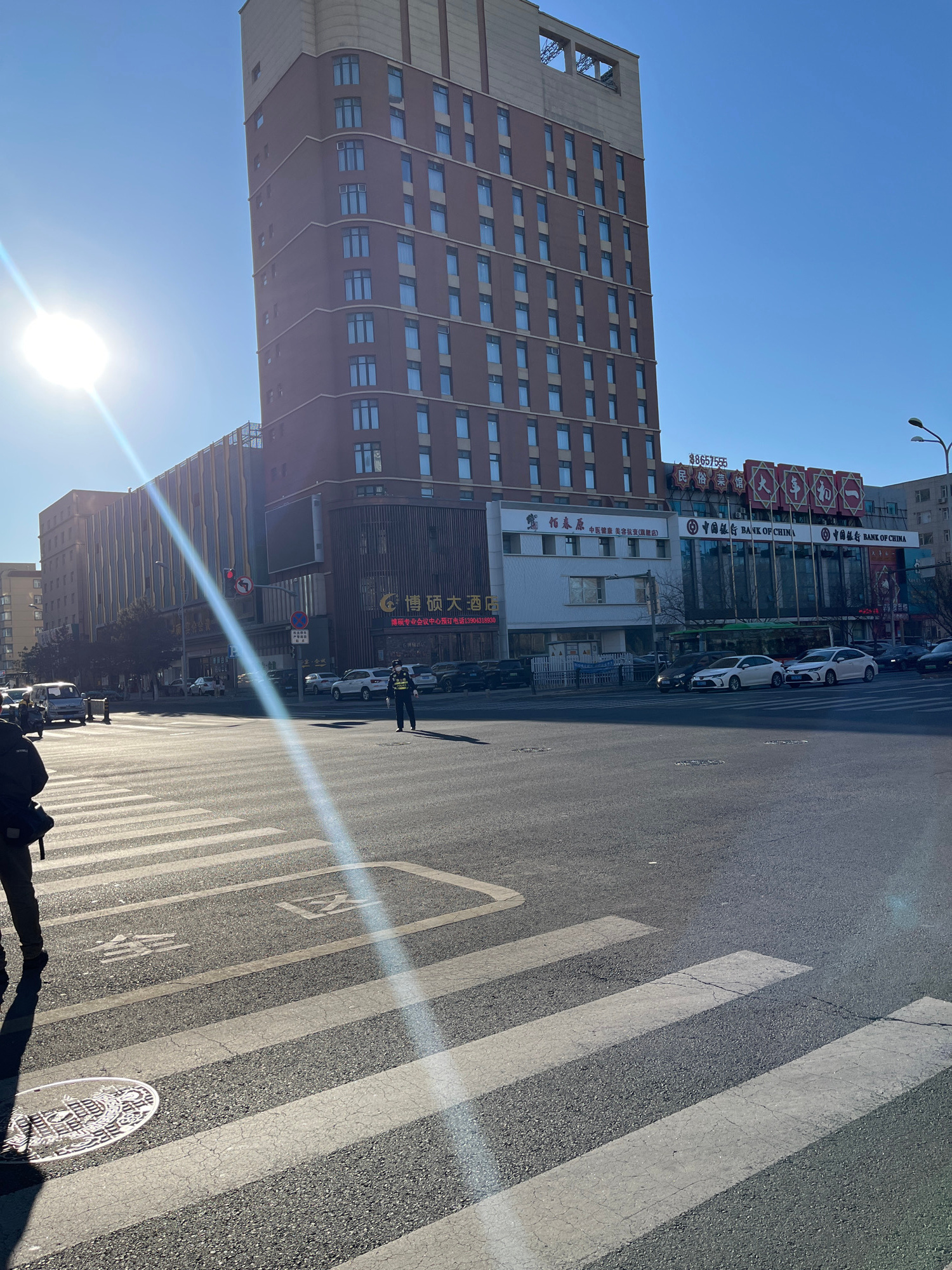 The image shows a street scene in Changchun City, China, under a clear, blue sky with the sun low in the sky. A tall, multi-story building, possibly a hotel or office building, dominates the left side…read more