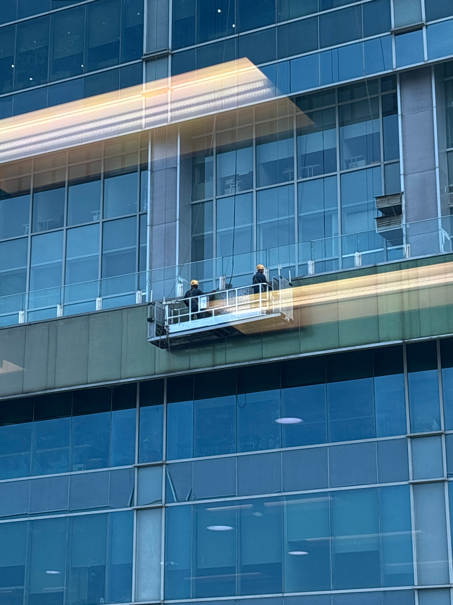From an elevated perspective, the image captures a modern glass-fronted building in South Jakarta, Indonesia. Two window washers are suspended on a motorized platform lift. The facade comprises a grid…read more