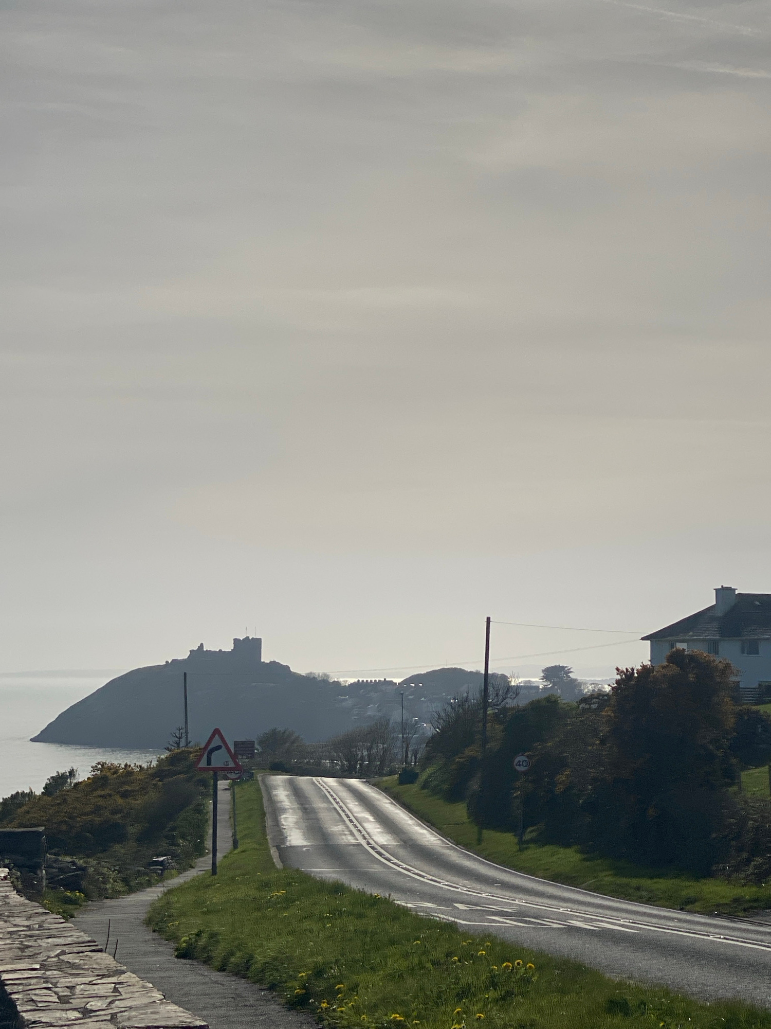 The image depicts a coastal scene in Criccieth, United Kingdom, characterized by hazy conditions obscuring the distant features. A wet, winding road dominates the foreground, flanked by green grass an…read more