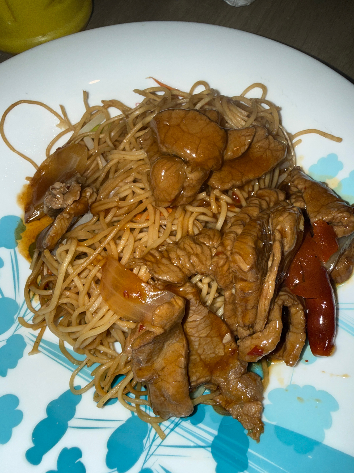 A plate of food consisting of noodles and meat. The noodles appear to be thin and yellowish-brown in color, possibly egg noodles. The meat is cut into bite-sized pieces and coated in a dark sauce. The…read more