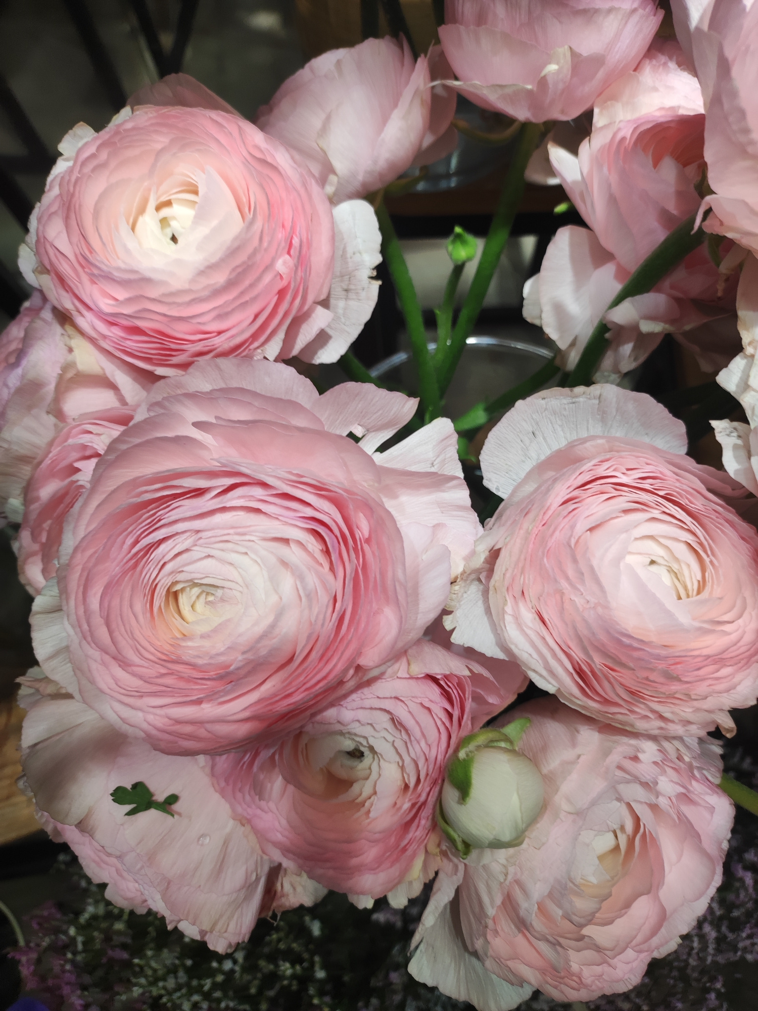 The image shows a close-up of a bouquet of light pink ranunculus flowers. The flowers are tightly packed together, with several fully open blooms displaying their layered petals. One bud is visible in…read more