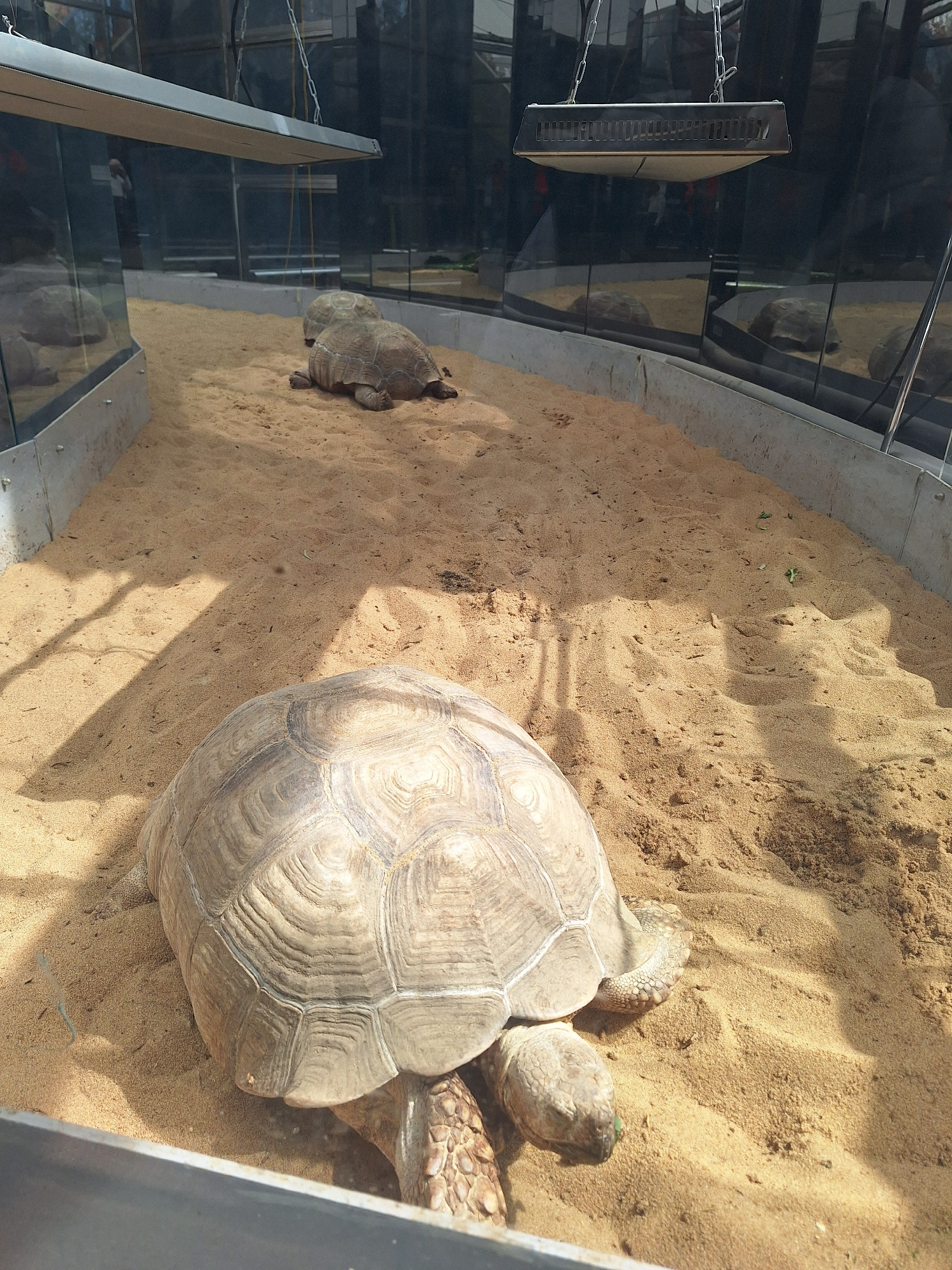 The image shows two tortoises in a sandy enclosure, likely within a zoo or exhibit. The enclosure appears to be indoors, behind glass. The larger tortoise dominates the right side of the frame, whileβ¦read more