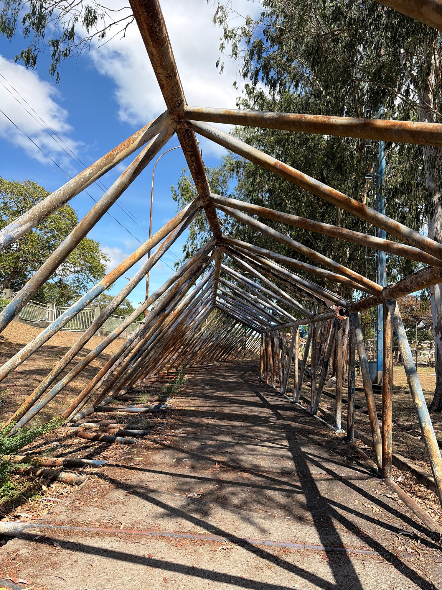 The image shows a long, narrow structure made of rusted metal pipes. The structure appears to be a dilapidated or abandoned walkway, potentially an old pedestrian bridge or elevated passageway. The me…read more