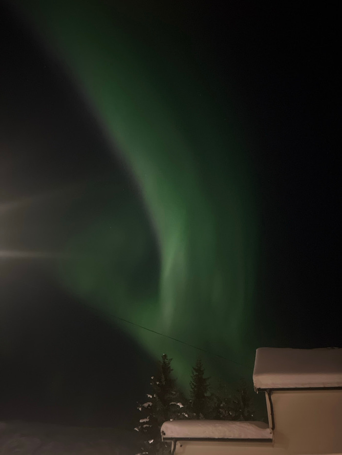 A dark night scene showcases the aurora borealis, with green hues painting the sky in a wavy pattern. In the lower portion, darkness obscures the ground, except for faint vertical light streaks. A str…read more