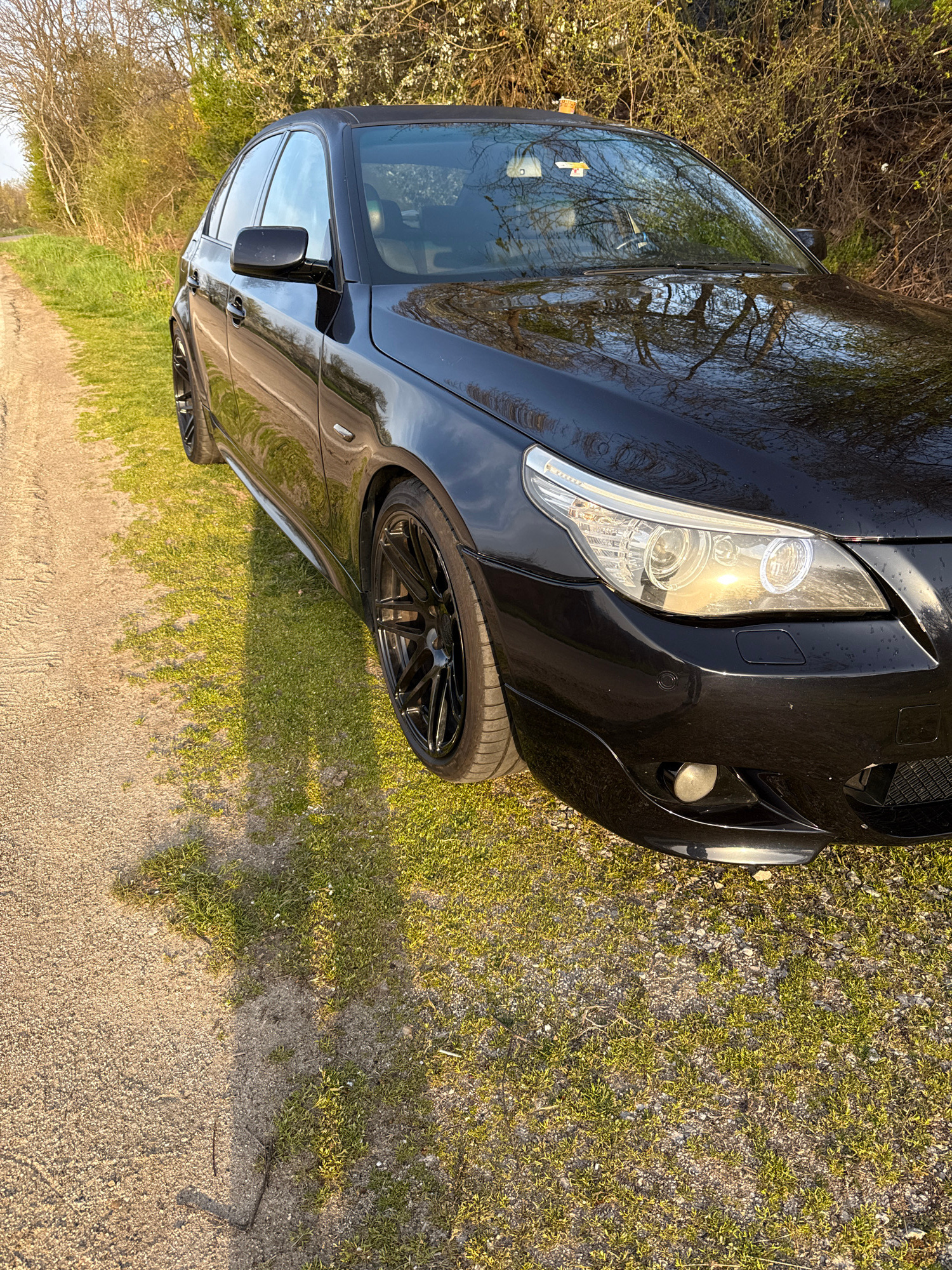 The image shows a close-up of the front of a black car, likely a BMW, parked on a dirt and gravel path next to a grassy area. The car's headlight is illuminated, and the windshield reflects the surrou…read more