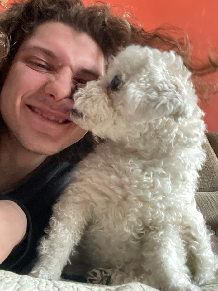 The image depicts an indoor scene focusing on the close interaction between one human male and one dog. A male individual, appearing young adult with fair skin and long, wavy brown hair, occupies theβ¦read more
