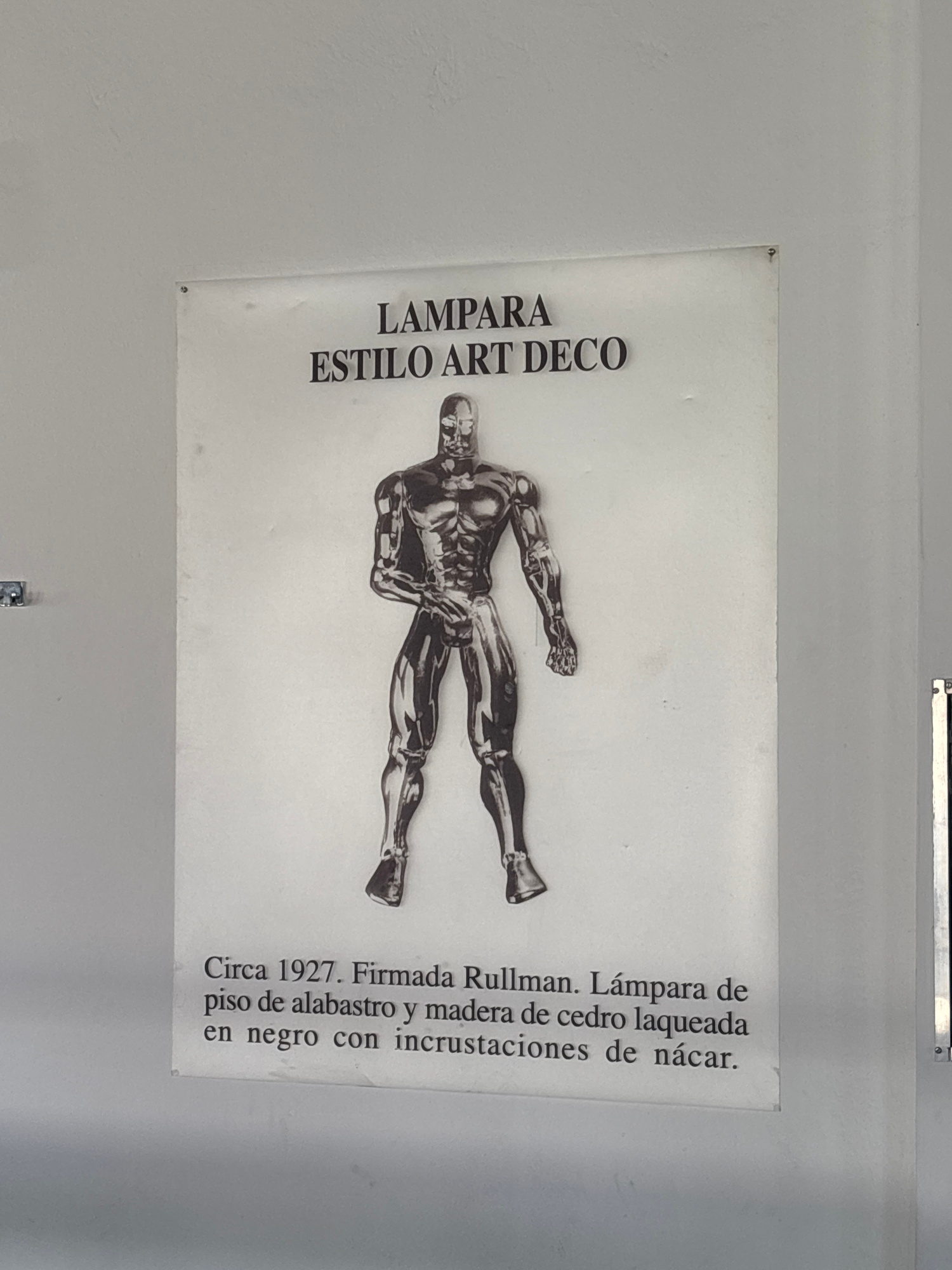 The image depicts a poster displayed on a light-colored wall. The poster features the text "LAMPARA ESTILO ART DECO" on the left and a description in Spanish on the right: "Circa 1927. Firmada Rullman…read more