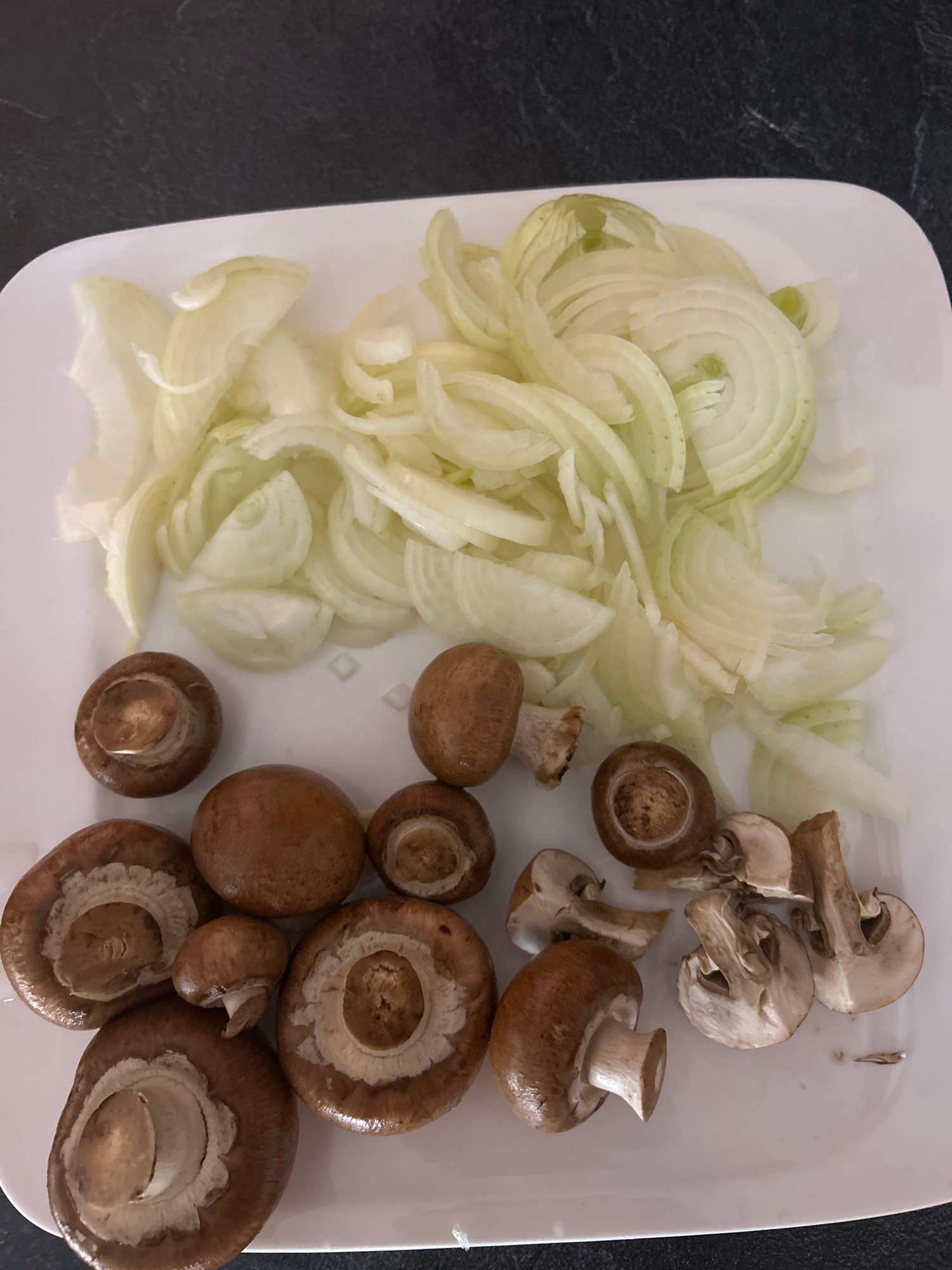 A white square plate is divided with sliced onions on the left and whole cremini mushrooms on the right. Some mushrooms are cut up. The plate rests on a dark, possibly granite, surface.