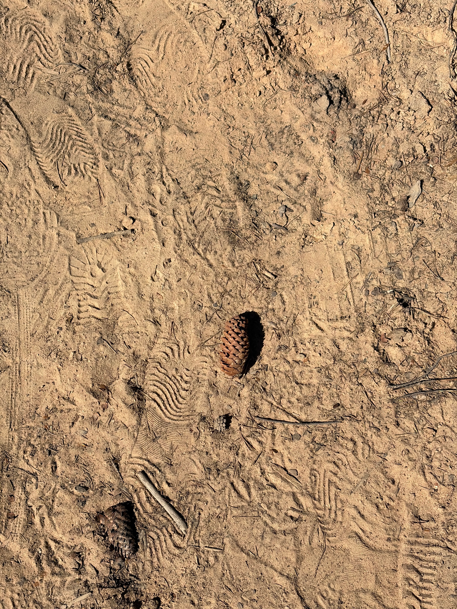 The image depicts a sandy surface with multiple footprints. The footprints vary in size and tread pattern, suggesting different types of footwear. There are scattered twigs, leaves, and debris on the…read more