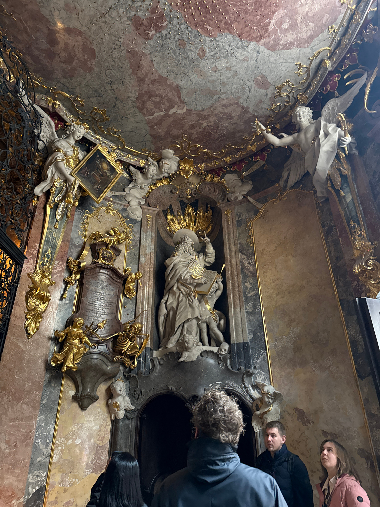 This image captures a detailed view of the Asam Church in Munich, Germany. The frame is filled with baroque ornamentation, including marble finishes, gold accents, and sculpted figures. The wall featu…read more